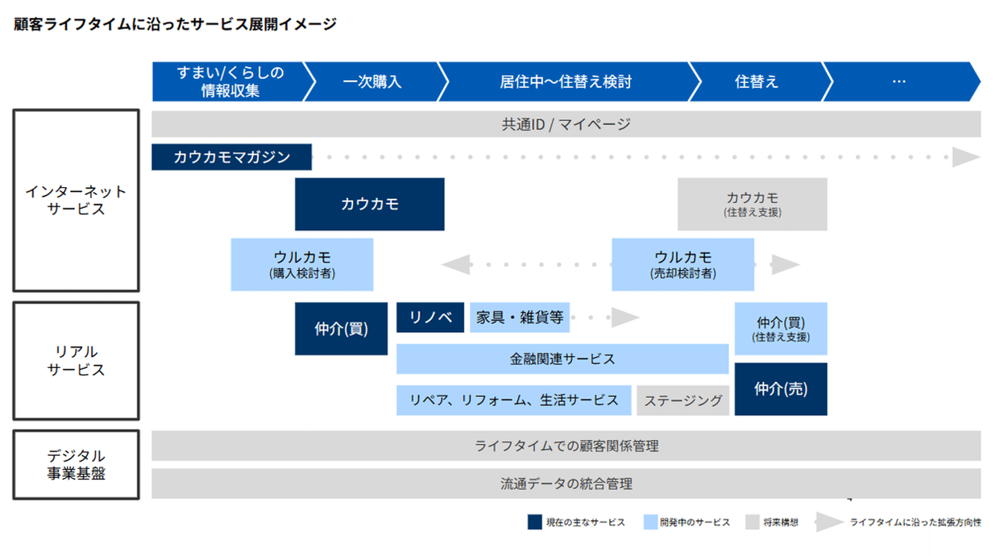 住まいや暮らしに関する情報収集、購入、居住、住み替えという一連のプロセスでお客様とつながり続けることで、住まいに関する不安や疑問を解消し、安心した生活を支えることができるようなサービスへと発展しているのです。