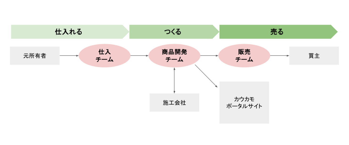デベロップメント部では「仕入」「商品企画」「販売」の3チームに分かれ、一つひとつの物件をバトンパスのようにつなぎながら、カウカモを利用されるお客様のニーズに合った物件を生み出しています。