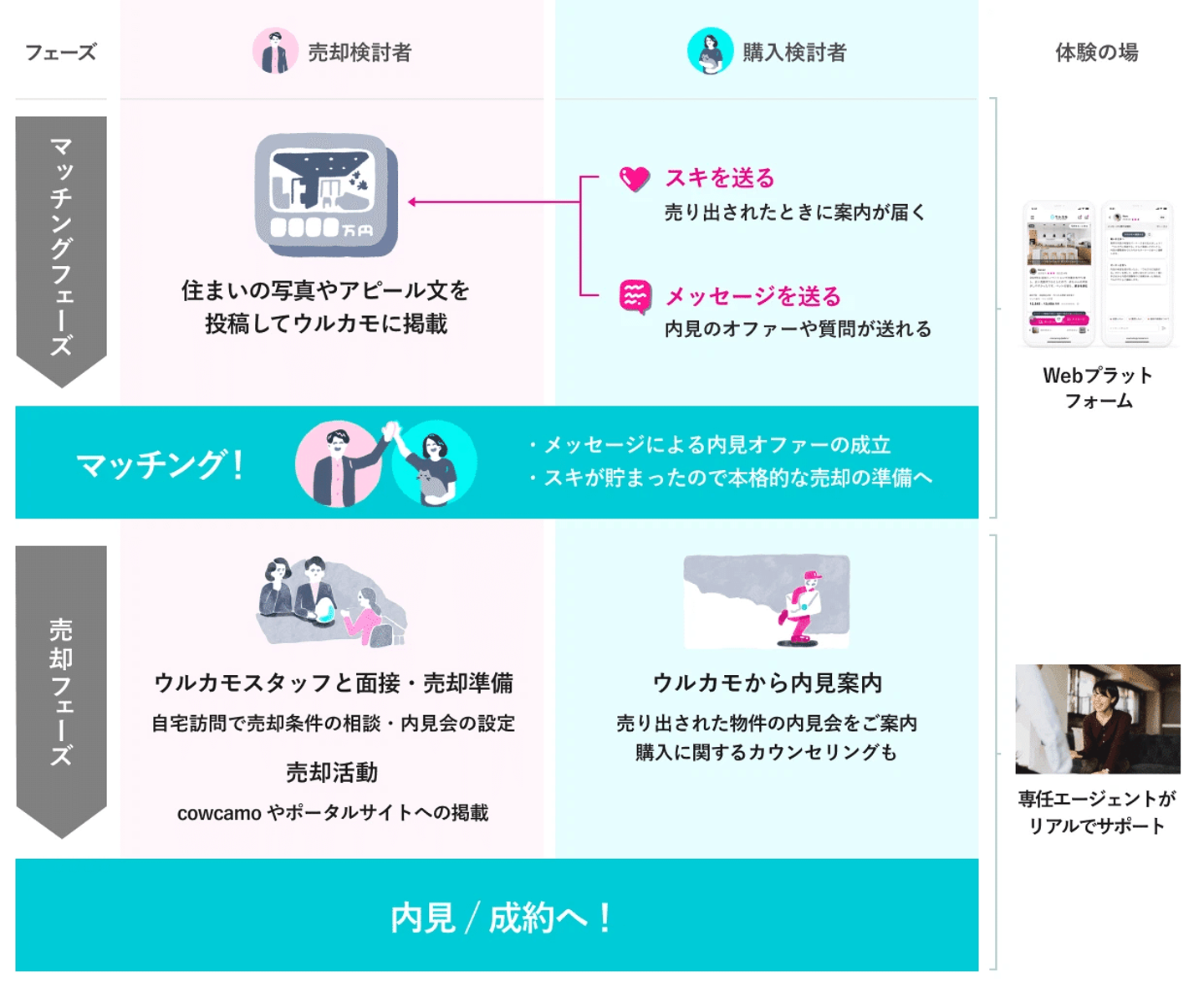 CtoCのプラットフォームですが、ウルカモ上でマッチングをしたら不動産のプロであるウルカモスタッフが内見や売買のご案内をするため、一気通貫でスムーズに住まいの売買ができます。