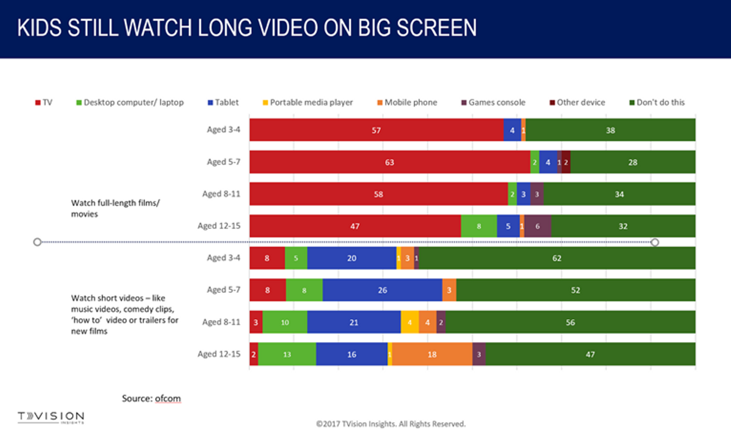 上半分が「30分以上の動画視聴に使うデバイス」、下が「それ以下の動画視聴に使うデバイス」それぞれで、3歳から15歳の若者(若すぎる気もするが…)の利用デバイスを聞いたところです。