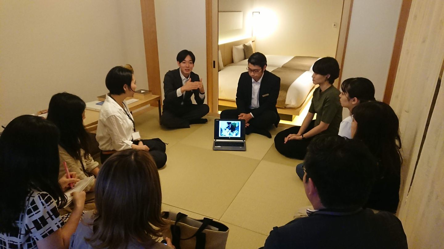 コンシェルジュの宮垣にバトンタッチし、ホテル カンラ 京都の見学ツアー。客室やフロント、スパ、ラウンジ、ショップはもちろん、普段は見ることのないバックヤードへも案内。施設見学だけではなく、ゲストを迎える前の準備や引き継ぎ業務など、ホテルの仕事の裏側も解説しました。