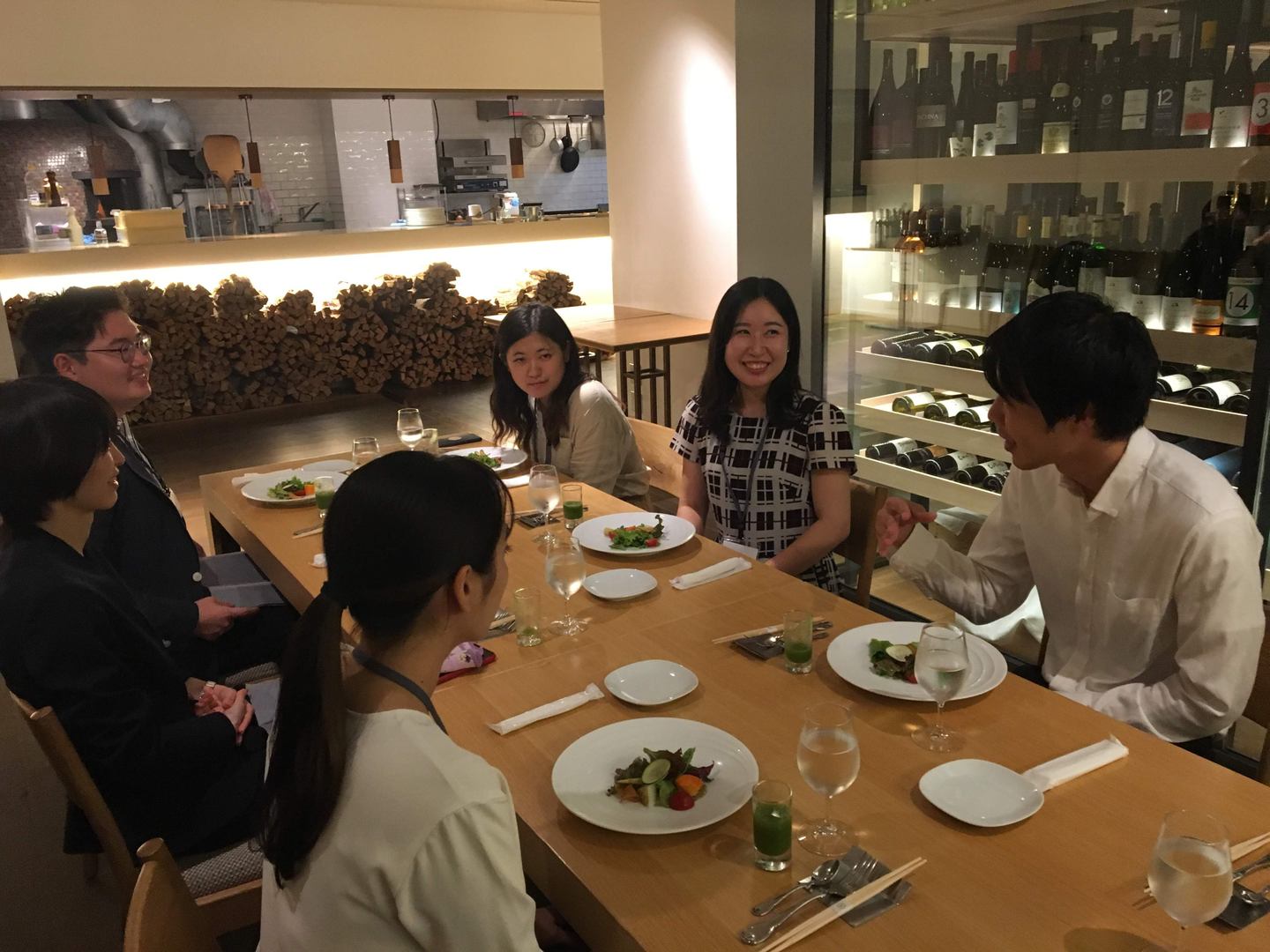 場所を移し、ホテル内のレストラン、ザ・キッチン・カンラへ。ホテルメンバーも一緒に、窯焼きピザやパスタを囲み一気に和やかムードに。緊張もすっかりほどけて、UDSを選んだきっかけ、将来の目標など、先輩も交え同期同士での会話も弾みました。