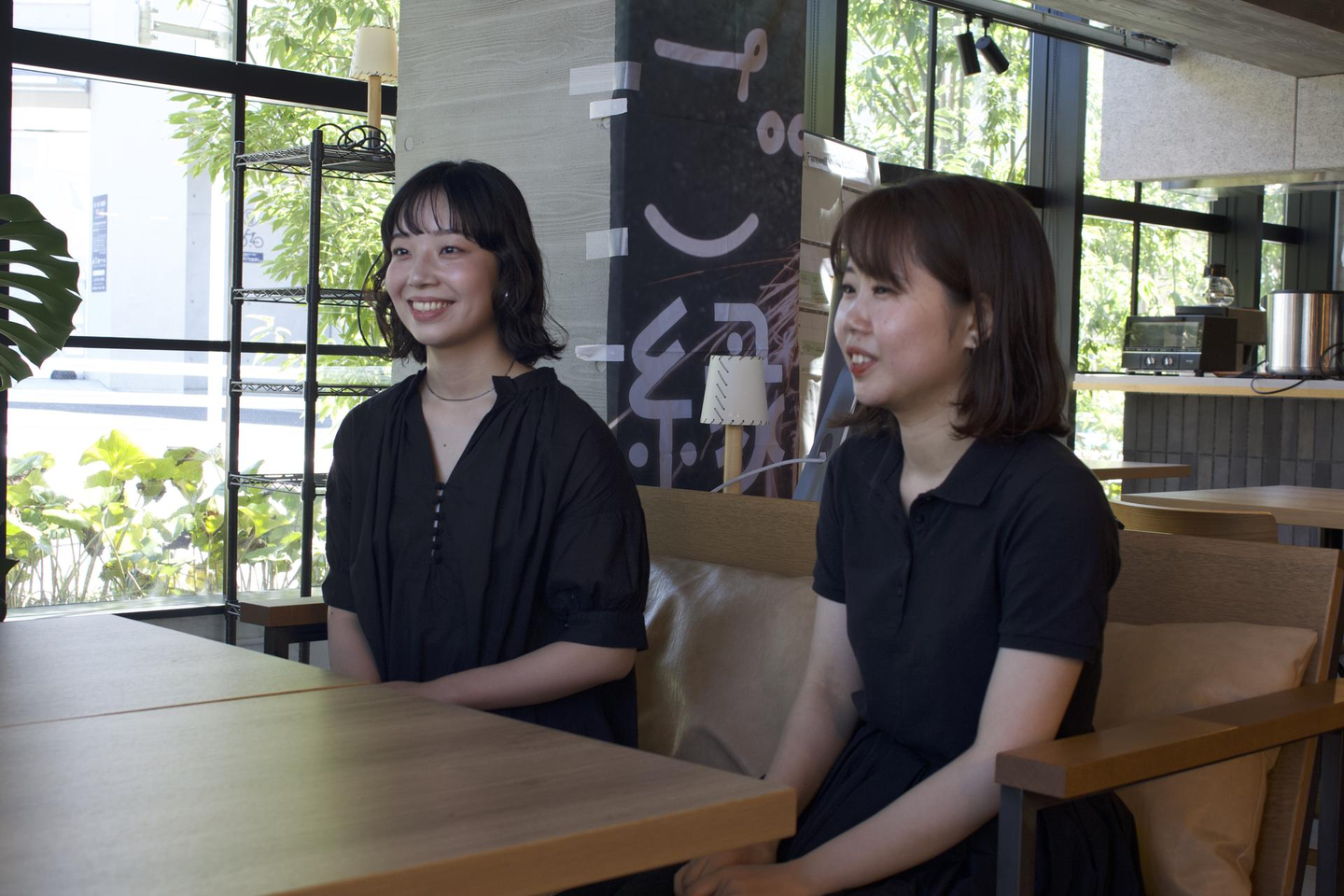 (左から) 河上鈴華:2021年4月入社。ホテル アンテルーム京都のフロントスタッフを経て、現在はプロジェクトデザイン事業部に所属。 南澤恵:2020年4月入社。COMPATHにて設計を担当。