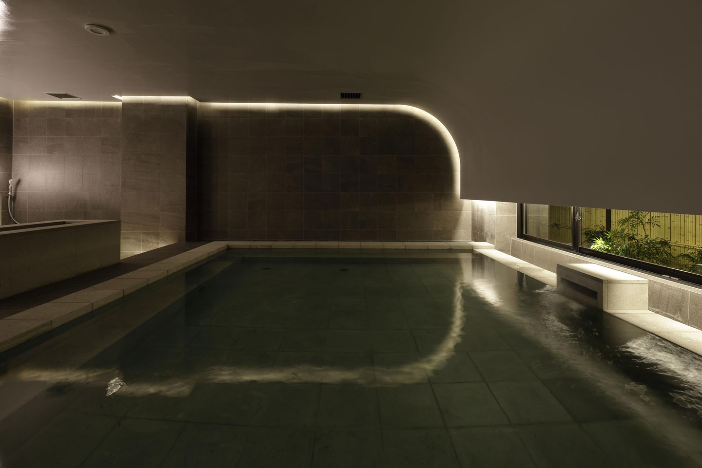 SOKI KANAZAWAの大浴場は、あえて浴槽の周りにコの字型の休める空間を作っています。これは、同じ石川県の加賀温泉などを見に行って、総湯(そうゆ)の文化を取り入れました。総湯とは温泉街の共同浴場のことで、みんなでお風呂に入り、周りで休憩しながら会話を楽しむような歴史的・文化的な背景があります。