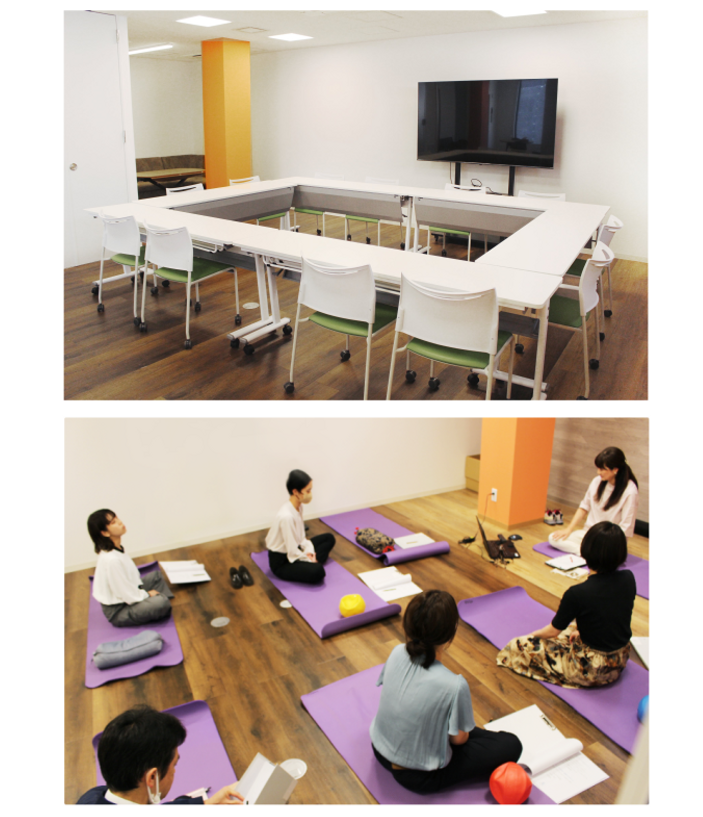 奥の部屋は部署会議や勉強会の他、マインドフルネス講習会など多目的室としての利用も♪