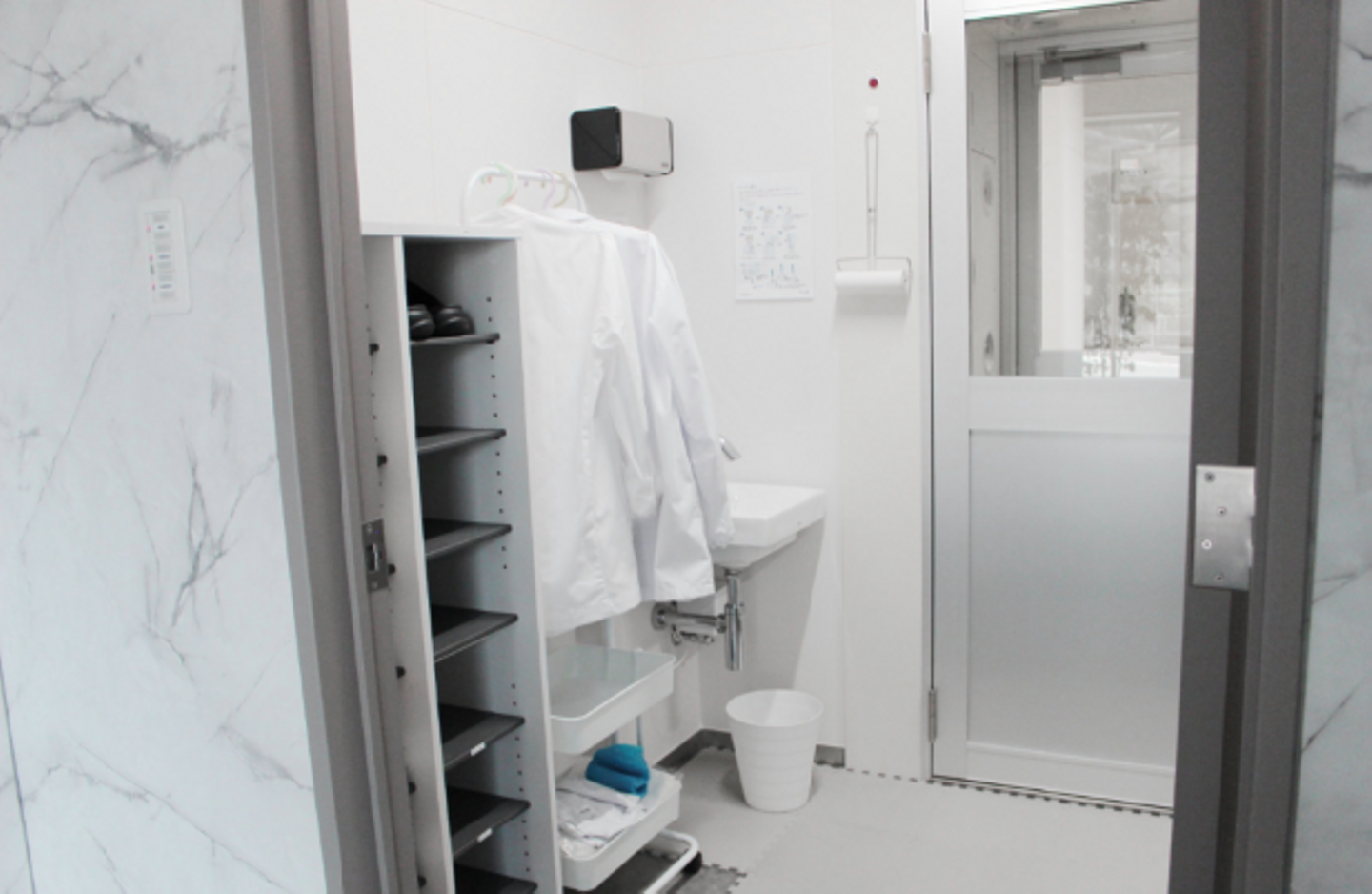 写真の扉奥に続くのは新しく導入されたエアーシャワー室!