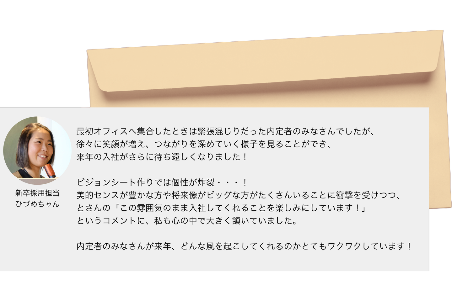 「この雰囲気のまま入社してくれることを楽しみにしています!」
