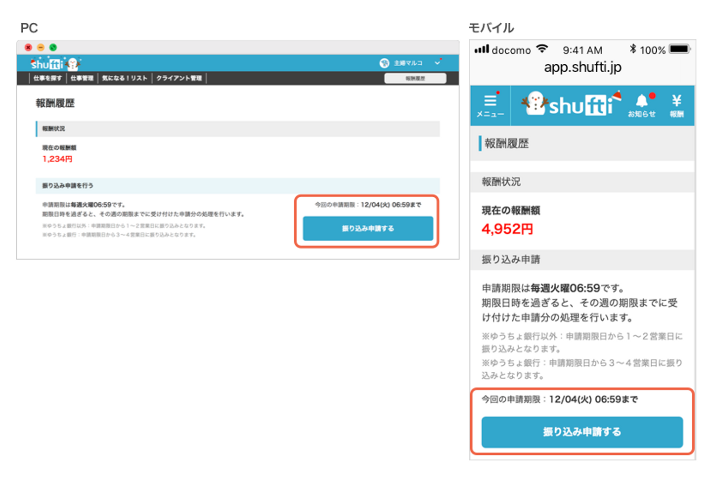 ワーカーは報酬履歴、クライアントは支払い履歴から振り込み申請ができます。