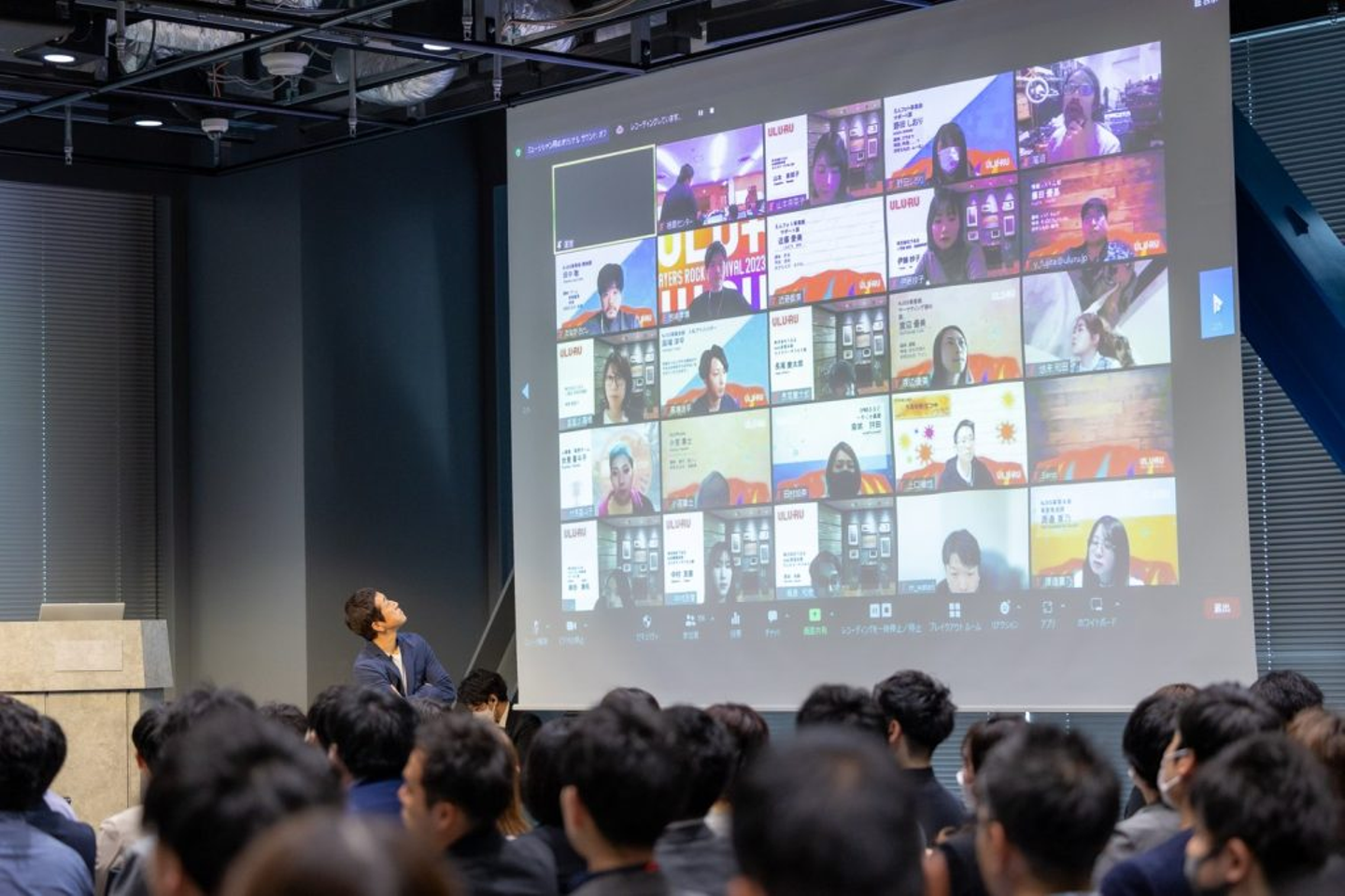 今回は会場右手にオンライン参加者のギャラリービューを常に投影していたので、これまでとはかなり異なる雰囲気です。