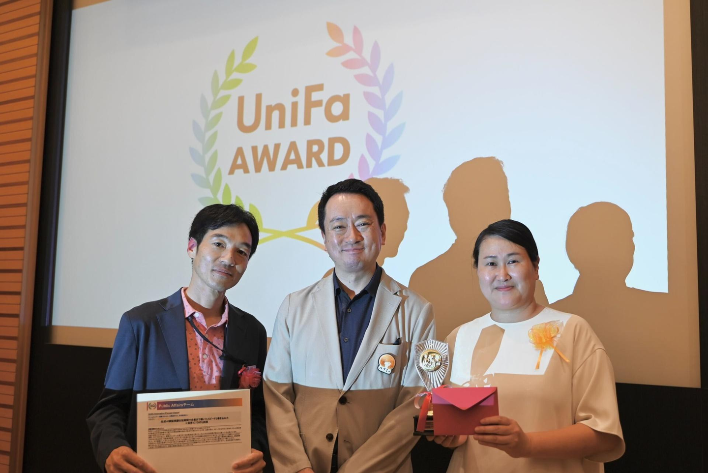 他のノミネート3チームにも、代表の土岐からバリューの実現と会社全体への貢献について、感謝の言葉が贈られました。その後、PAチームへのUnifa Award授与をもって、今回の全社総会は閉幕しました。