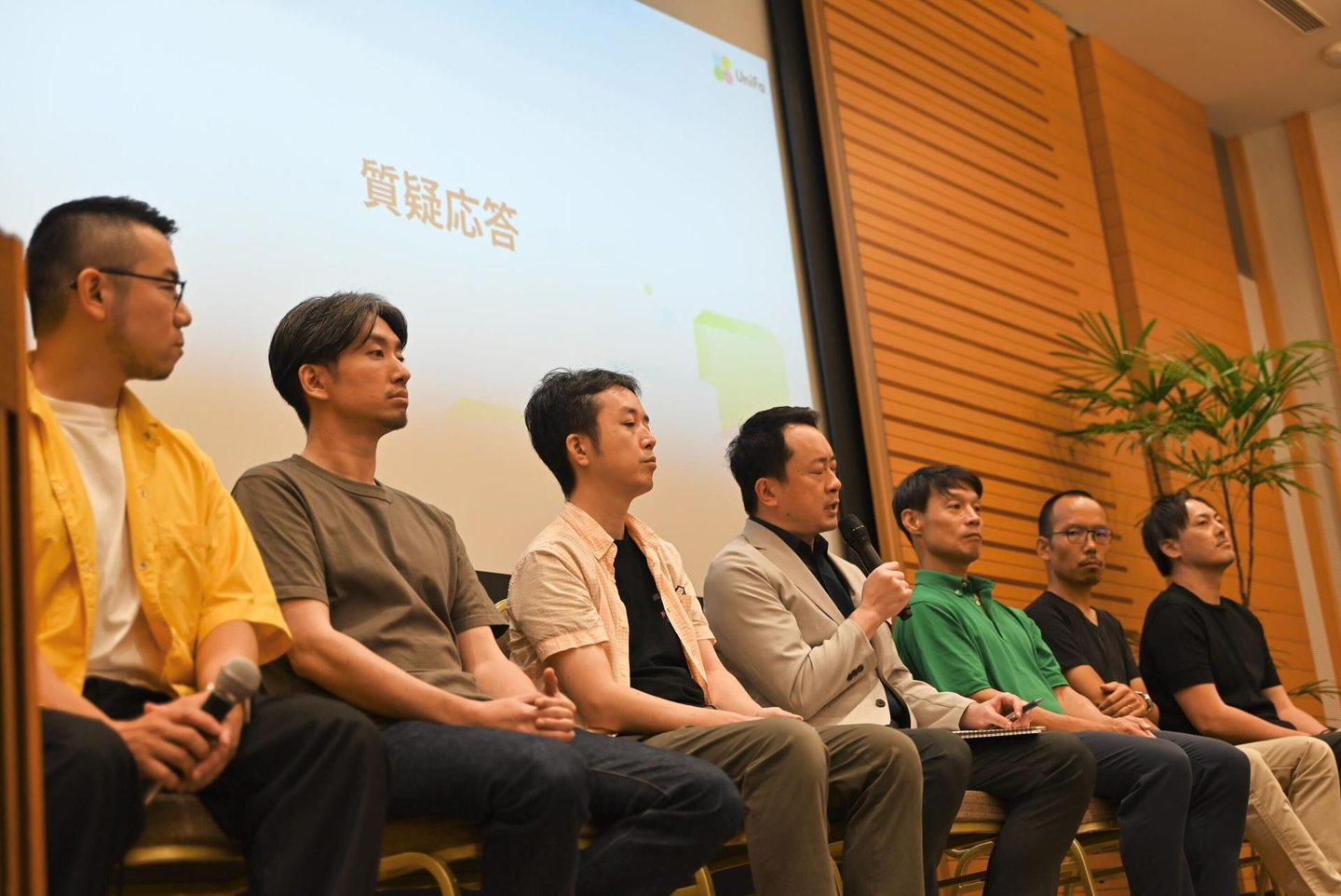 後半の質疑応答では、代表の土岐と 本部長および副本部長が登壇。ユニファ社員から、第一部前半やこれまでの疑問・質問が各経営チームに投げかけられました。