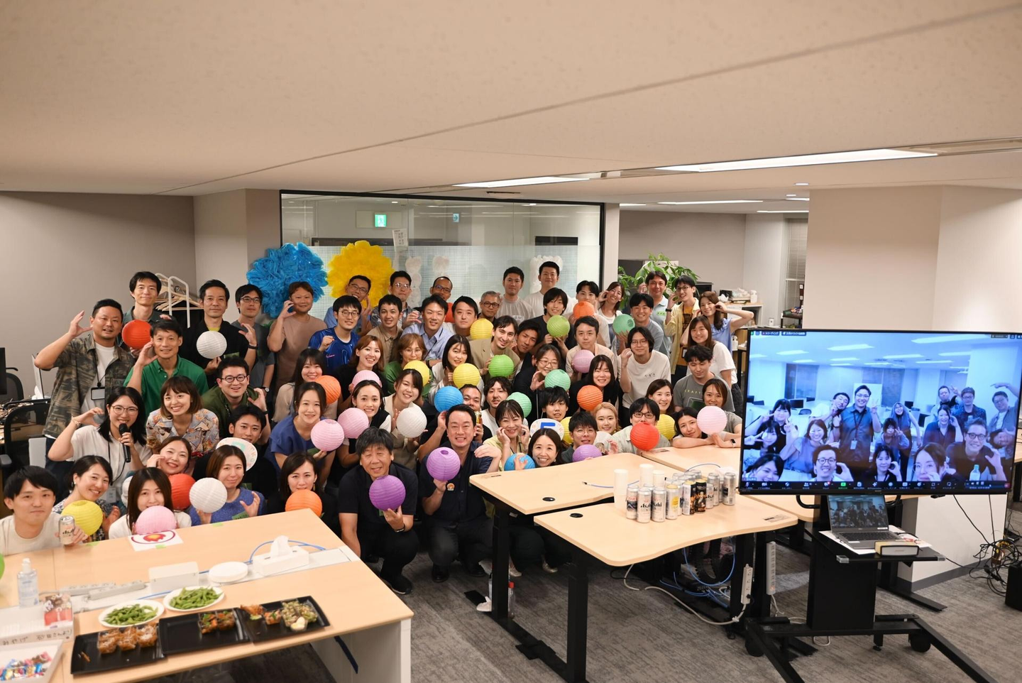 ユニファは全社総会終了後に懇親会を毎回開催しています!長丁場の全社総会で士気を高めた後は、同じ目標を目指す仲間同士で乾杯!東京オフィスの懇親会会場はユニファカラーで彩られ、より明るい雰囲気に!