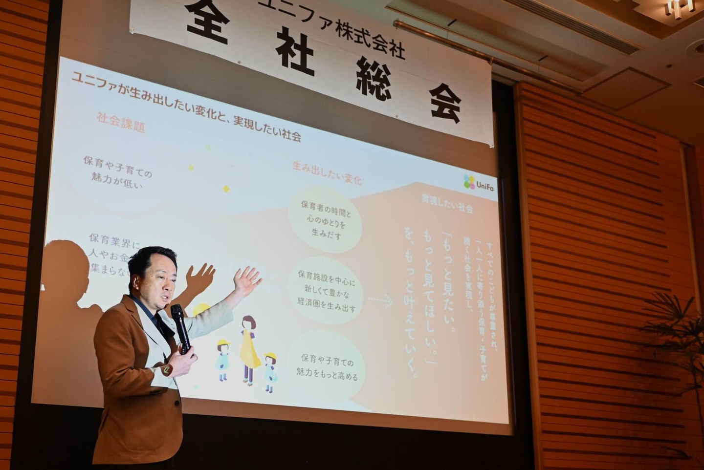 冒頭では、ユニファがなぜこの挑戦を始めたのか、その原点に立ち返る時間が代表土岐からありました。「一番大切な家族のために」という想いから始まったユニファの事業。保育・子育てにおける社会課題と向き合い、「家族の幸せを生み出す あたらしい社会インフラを 世界中で創り出す」というパーパスを掲げ、これまで多くの保育施設をはじめとしたさまざまなステークホルダーの方々と共に歩んできました。