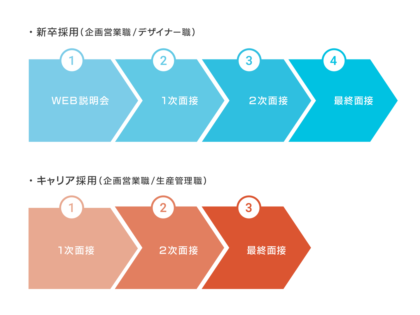 新卒採用は「企画営業職」と「デザイナー職」を、キャリア採用は「企画営業職」と「生産管理職」を主に募集しています(2025年2月現在)。
