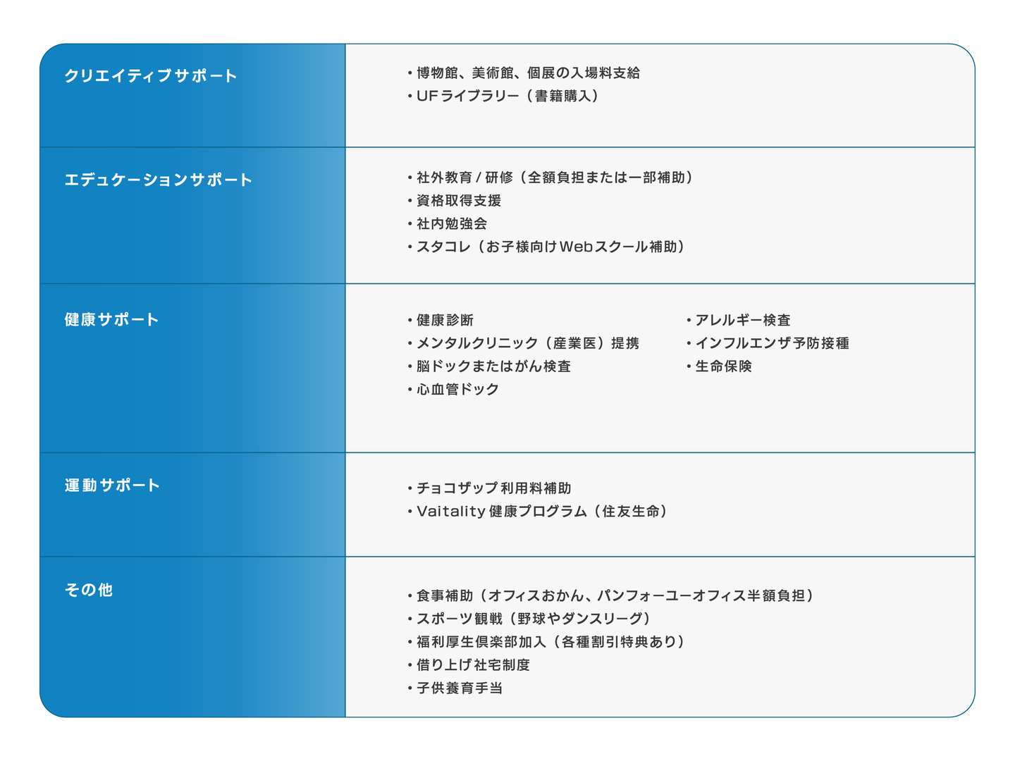 ――ユニファーストでは、社員が働きやすい環境を作るためにさまざまな福利厚生制度を導入しています。具体的な内容を教えてください。