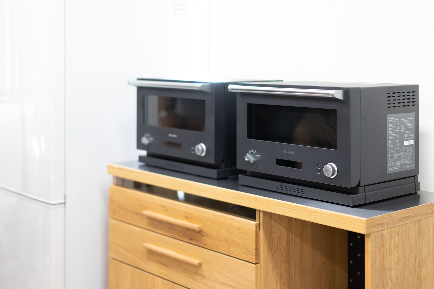 スタッフのバックヤード部分なのですが、バルミューダのオーブンレンジも導入しました。小気味よい音楽と共に、料理を温めてくれます。(※本当はカードの溜まってたポイントで購入)