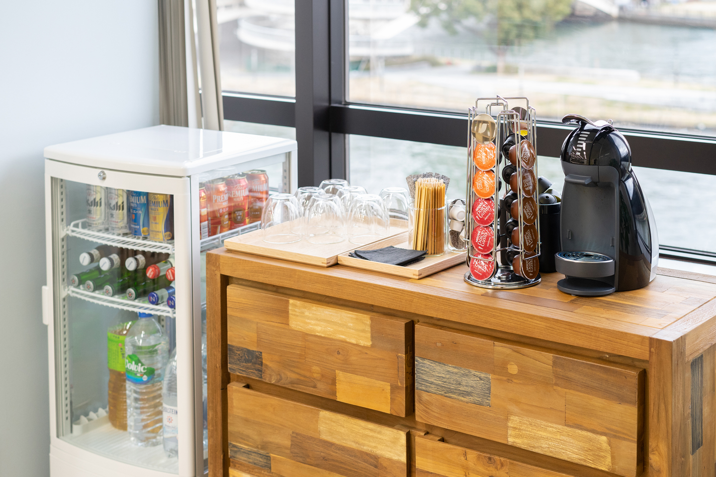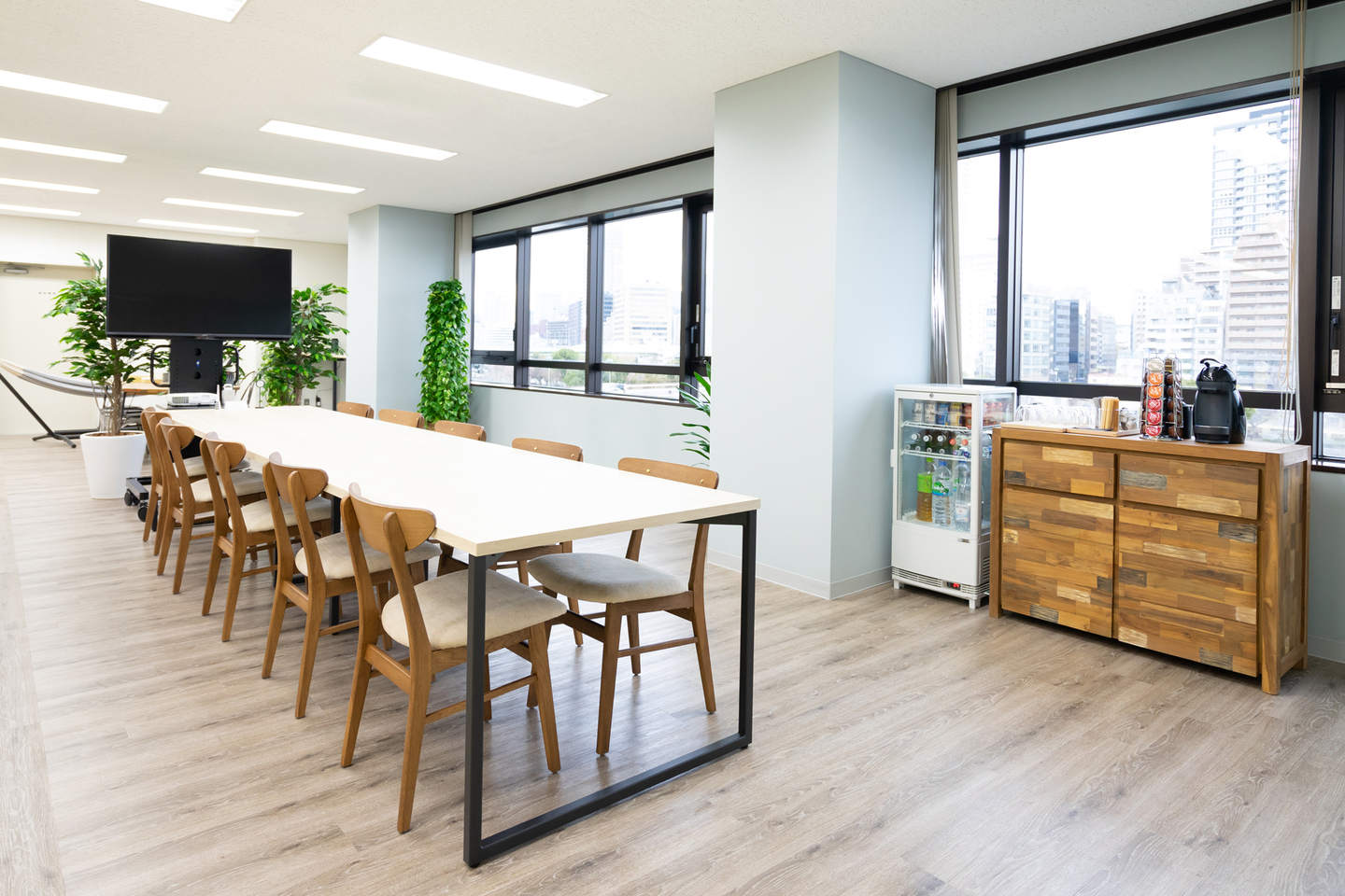 ミーティングをより快適に行うため、ミニカフェカウンターを設けました。本当は豆から挽くマシンを設置したかったのですが、一旦段階的にネスカフェのドルチェグストを設置しています。今のところ「リッチブレンド」「コロンビア」「カフェラテ」「ミルクティー」の4種類を取り揃えています。
