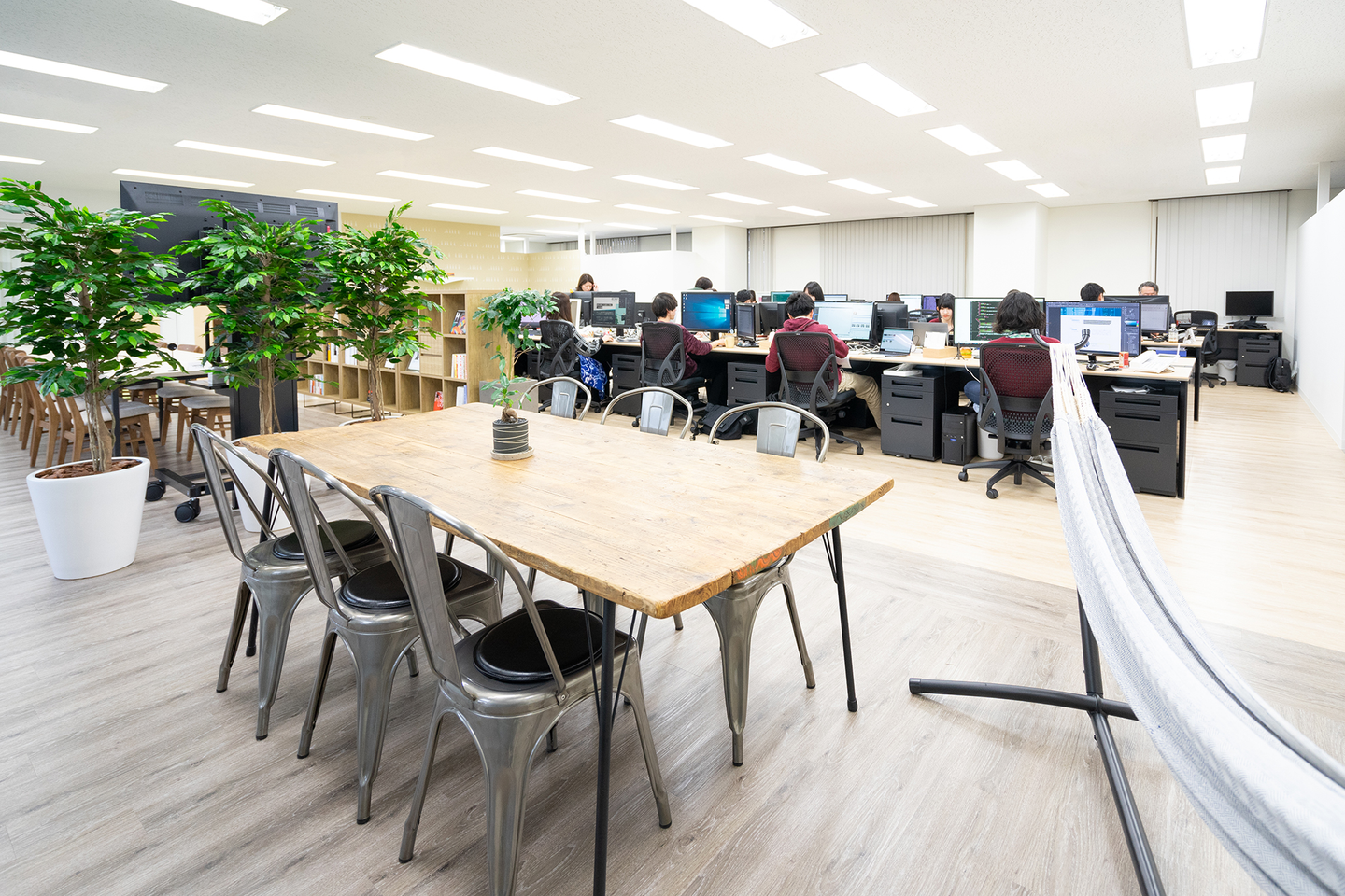 前オフィスからやってきた唯一の家具たちです。工事現場の足場を加工して作ったテーブルはフリーアドレス用のデスクになりました。社員の子供が来社するとテンションが爆上がりするハンモックも健在です。