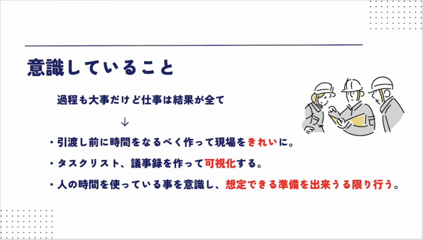 確認作業はとても重要です。例えば、「職人さんが言っていたのは、きっとこういうことだろう」となんとなく理解した程度だと、齟齬が生まれて間違った方向に施工が進んでしまいます。なので、確認したいときは「こういうことですよね?」と聞いたことを一旦自分で説明してみて、間違っていないか確認するようにしています。あとは、報告や相談もまめにしようと心がけていますね。これも、心配性からくるものだと思います。