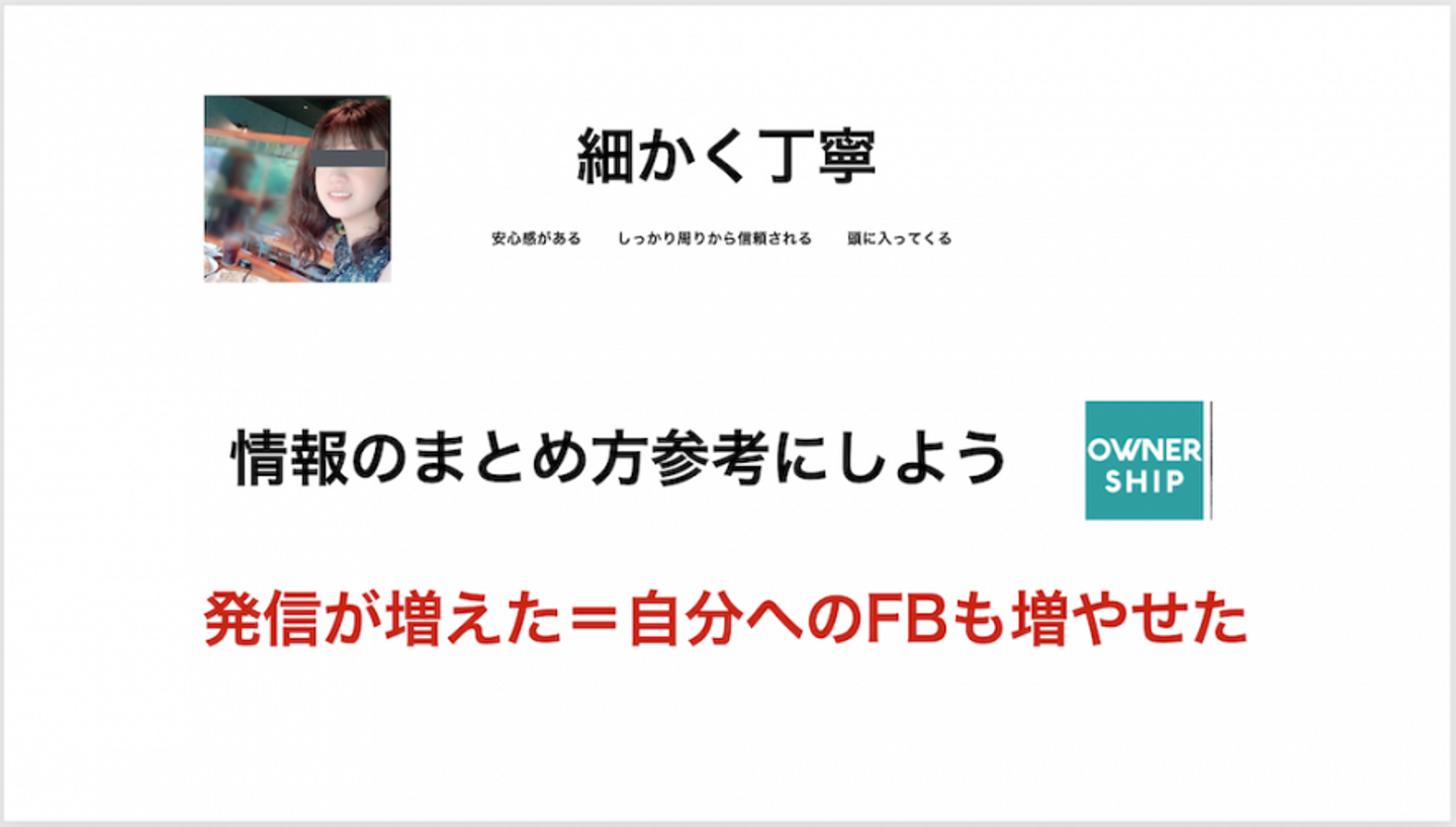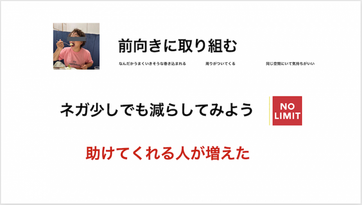 ―― ほかにも「人の良いところを真似する」というポイントも紹介していました。スピーチ用に作っていたスライドも、この項目だけかなりページを割いていたかと。