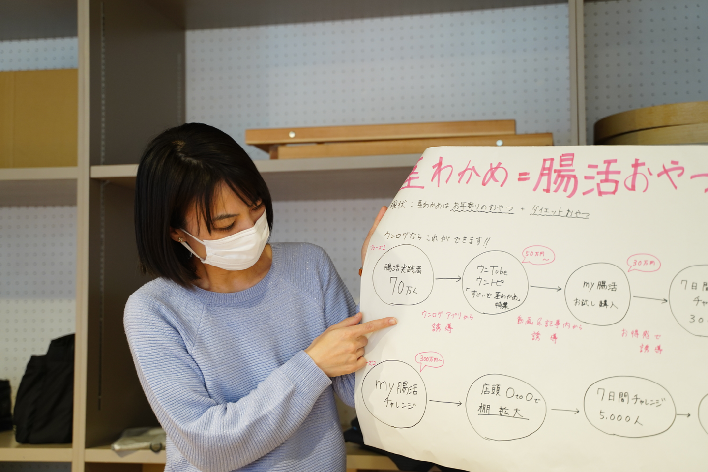 合宿の冒頭では、現在のウンログの立ち位置や今後の戦略、そして「my腸活」についての勉強会を行いました。ここで改めて「my腸活」の事業モデルを確認し、クライアントにどんな利益を提供できるのか考えました。その後、模擬営業のワークショップを通じ、「my腸活」がクライアントの課題をどう解決できるのか、プレゼン形式でアウトプットしました。