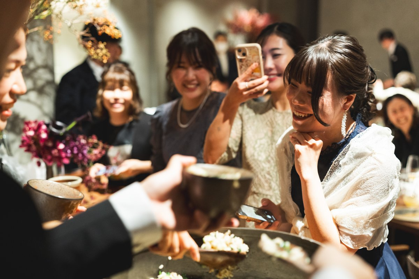 佐藤:釜飯は、IWAIの象徴的な一皿です。「同じ釜の飯を食う」という日本の文化を、結婚式という場に昇華させた演出で、新郎新婦がゲストに自ら振る舞います。料理を手渡すその瞬間に会話が生まれ、表情が和らぎ、空間に一体感が生まれていく。料理が人と人の心をつなぐ時間になるんです。
