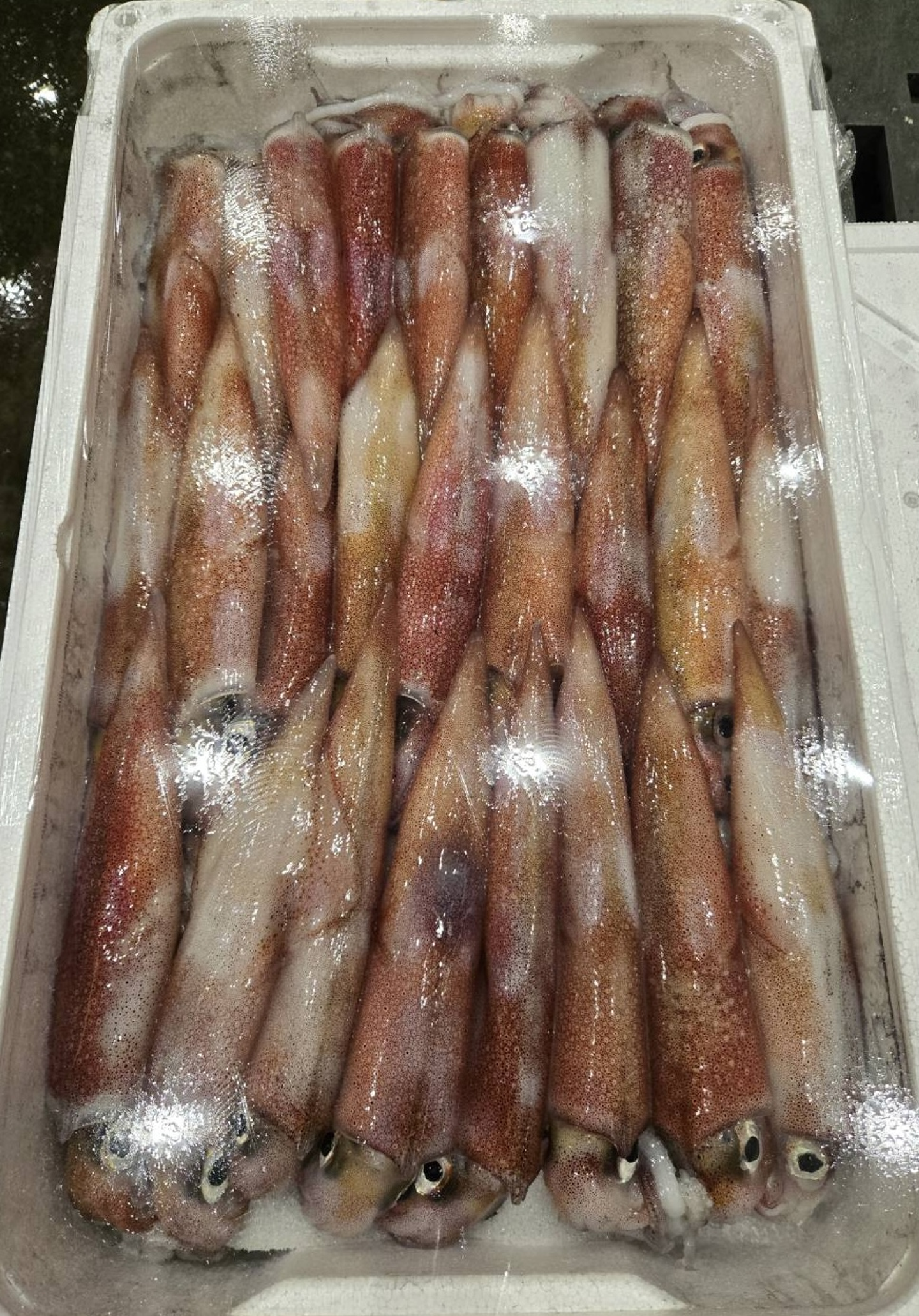 獲れてすぐは(記事のトップ画像のような)透明に近い白色をしていますが、豊洲に着くころにはつやつやの赤みがかった体色になっています。