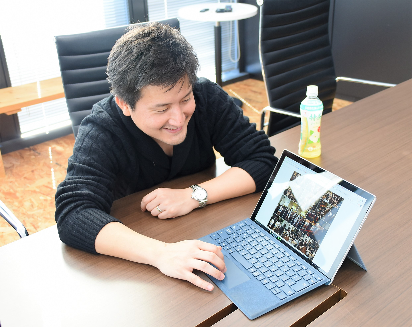 (PCにいつも入れている写真でYear End Partyの歴史を振り返り、ニヤニヤが止まらない稲垣)