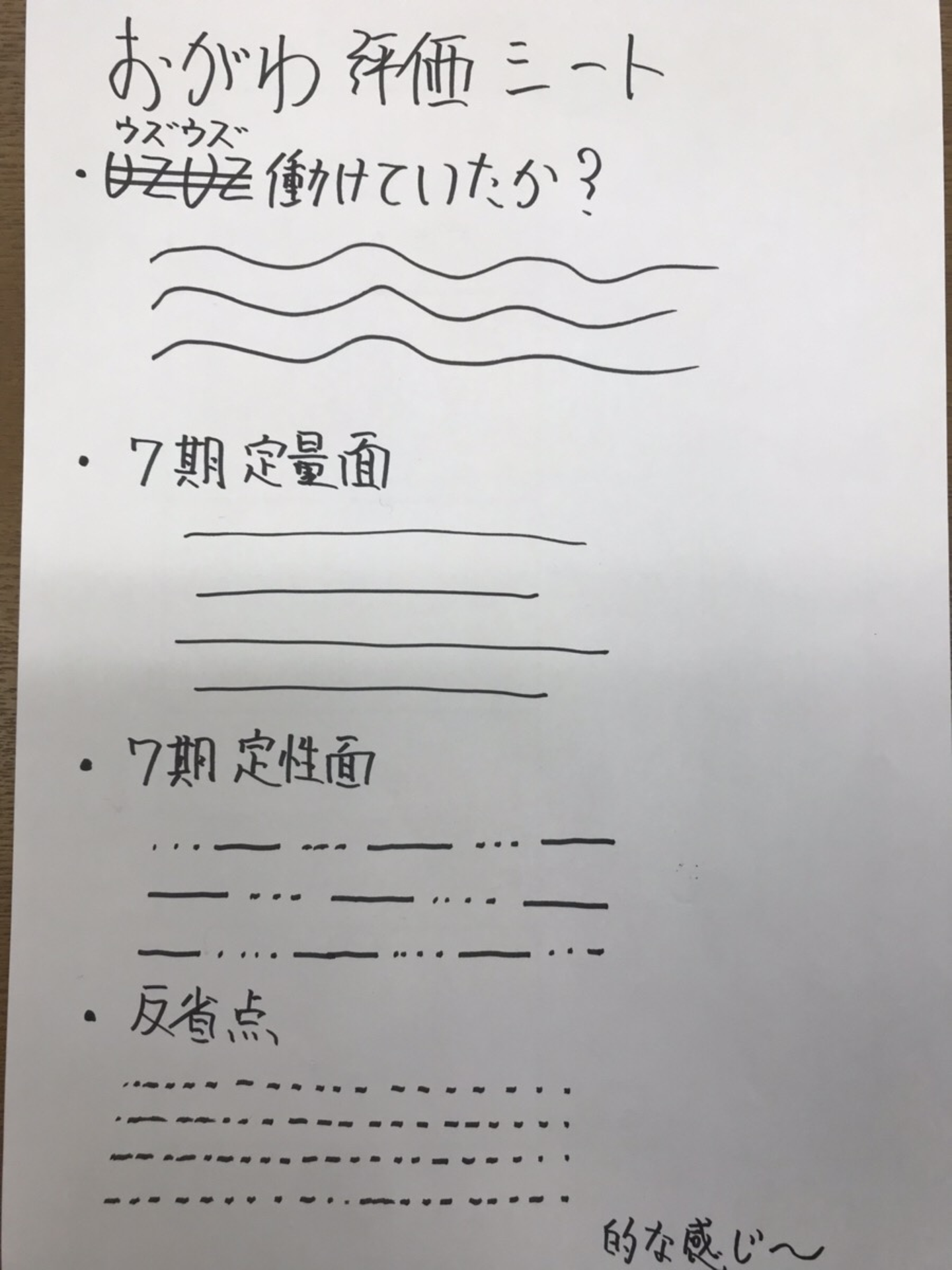 評価のミーティングの場にはこのようなものを持ち込んで話すのだな〜と思って頂けたらOKです!