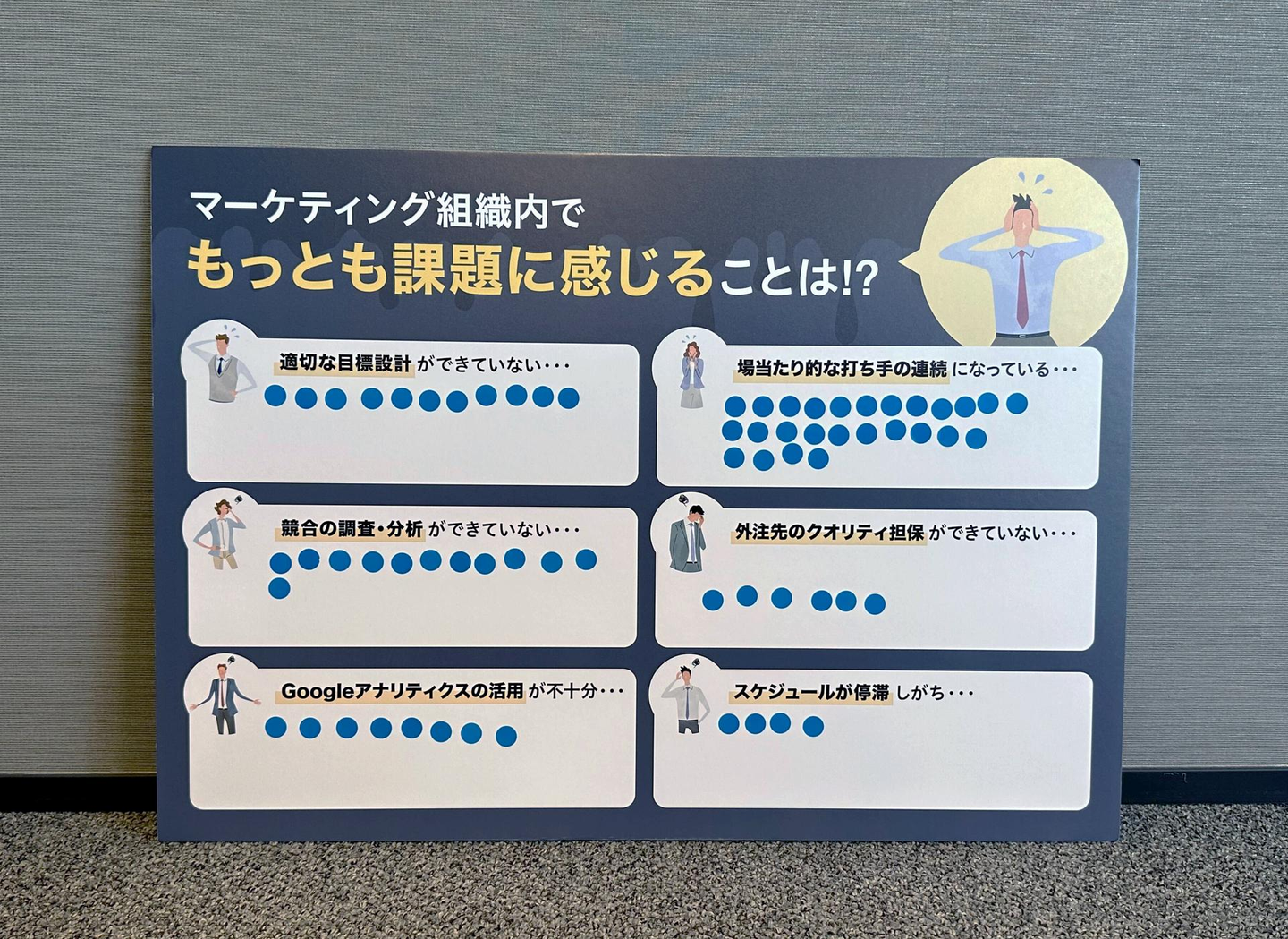 当日、ブース前では、マーケターの方を中心に「マーケティング組織内でもっとも課題に感じること」についてアンケートを実施しました。6つのよくある課題について、それぞれ当てはまるものにシールを貼って頂きました。