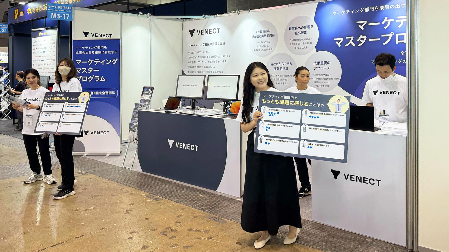 今回VENECTは、これまでのマーケティング支援により獲得したナレッジを活かして、マーケターの育成を目的とした「マーケターマスタープログラム」をメインに出展しました。自社のマーケティング部門における研修をご検討の方、これから新設する方、マーケティング戦略や実践的なスキルを学びたい方に向け、当プログラムのご案内を行いました。