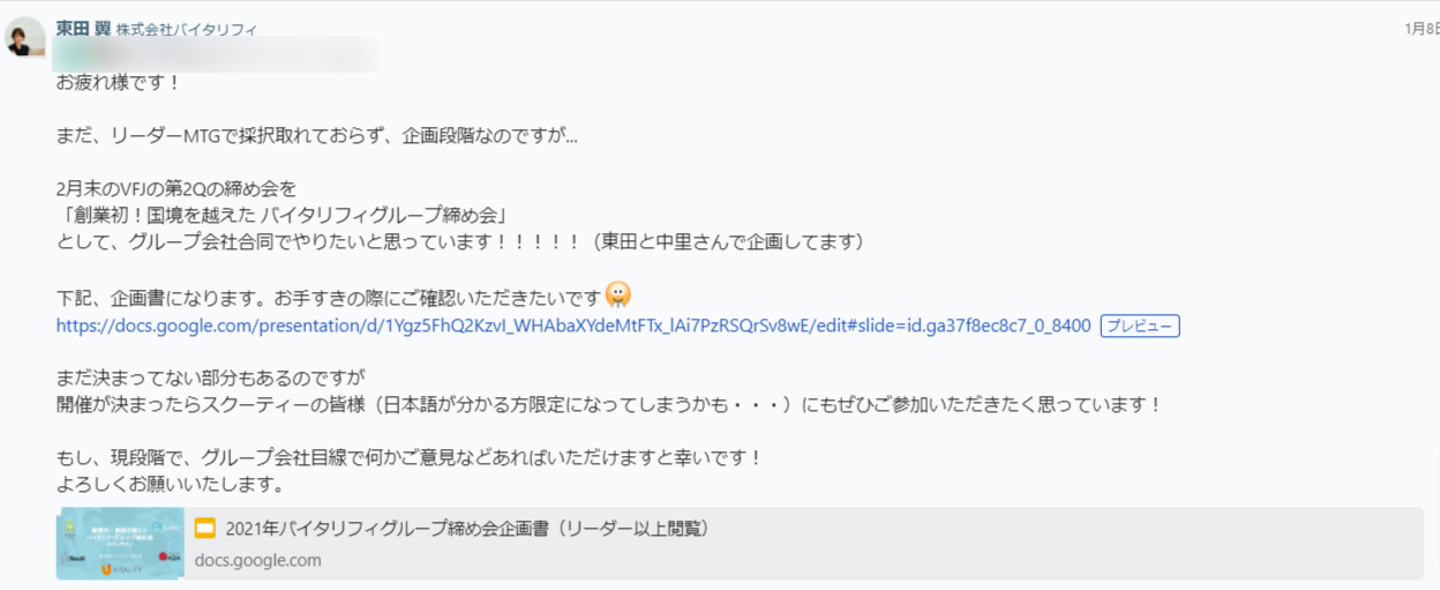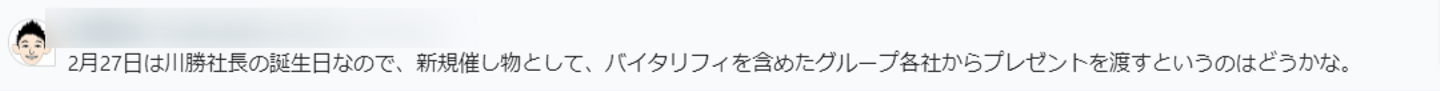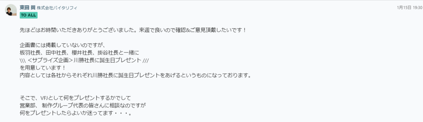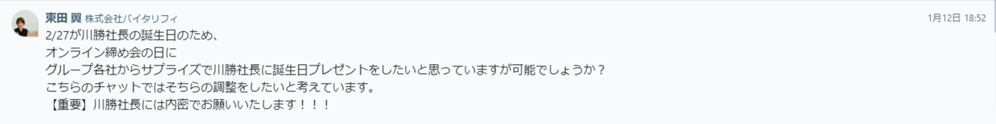 バイタリフィ内でもプレゼント計画を実施するため、社長を除いた幹部陣を集めたチャットグループを作成。社長にばれないように、打ち合わせはできないので、全部チャット内で決めていかなきゃいけず、終始わたわたしてました。(笑)