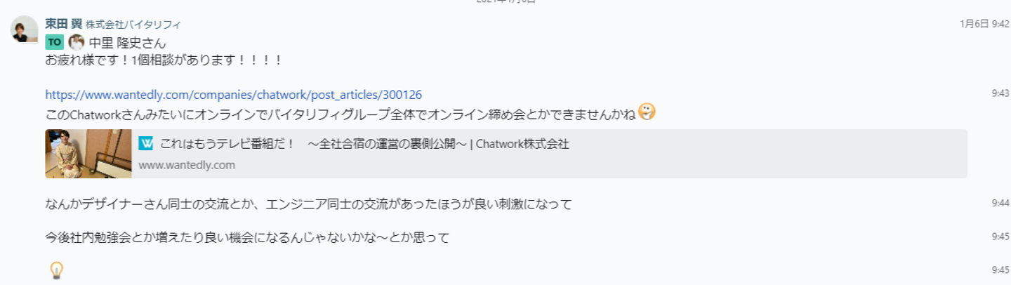 管理部の中里さんにふとチャットしたのがきっかけでした。