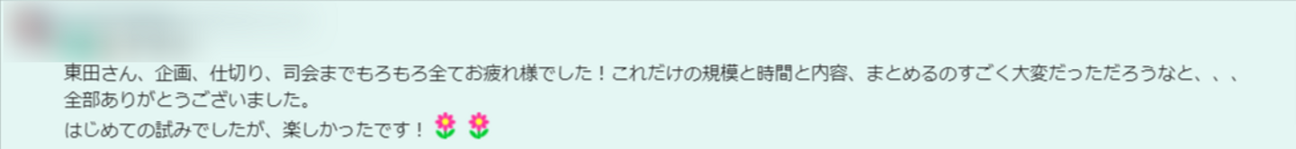 そして、今回は“締め会”なので、より“楽しさ”が重要になってくる部分でもあるので、参加者自身でコメント(感情)のアウトプットを積極的に行ってもらい、みんなで作り上げる形式のオンライン締め会にしました。(^^)/
