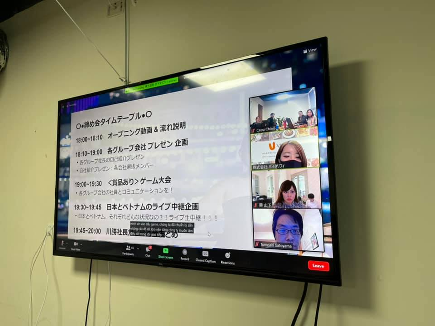 ➡ベトナム拠点では全社員が出社しており、モニター1台に対して複数人で閲覧することが可能!そのため、ZOOMのアカウントは社員数に依存せず100台以下で収まる!