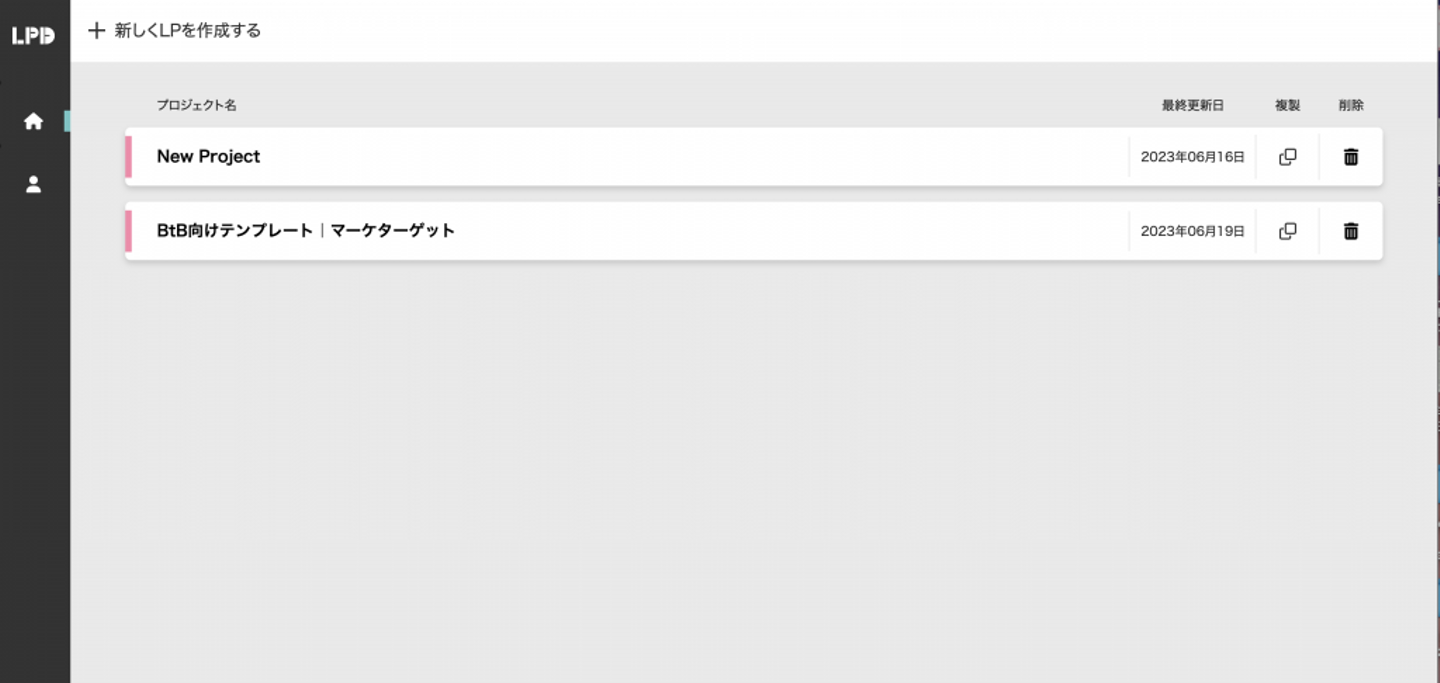 保存されたLPはプロジェクトファイルとしてクラウド上で管理され、いつでも編集を再開することが可能です。