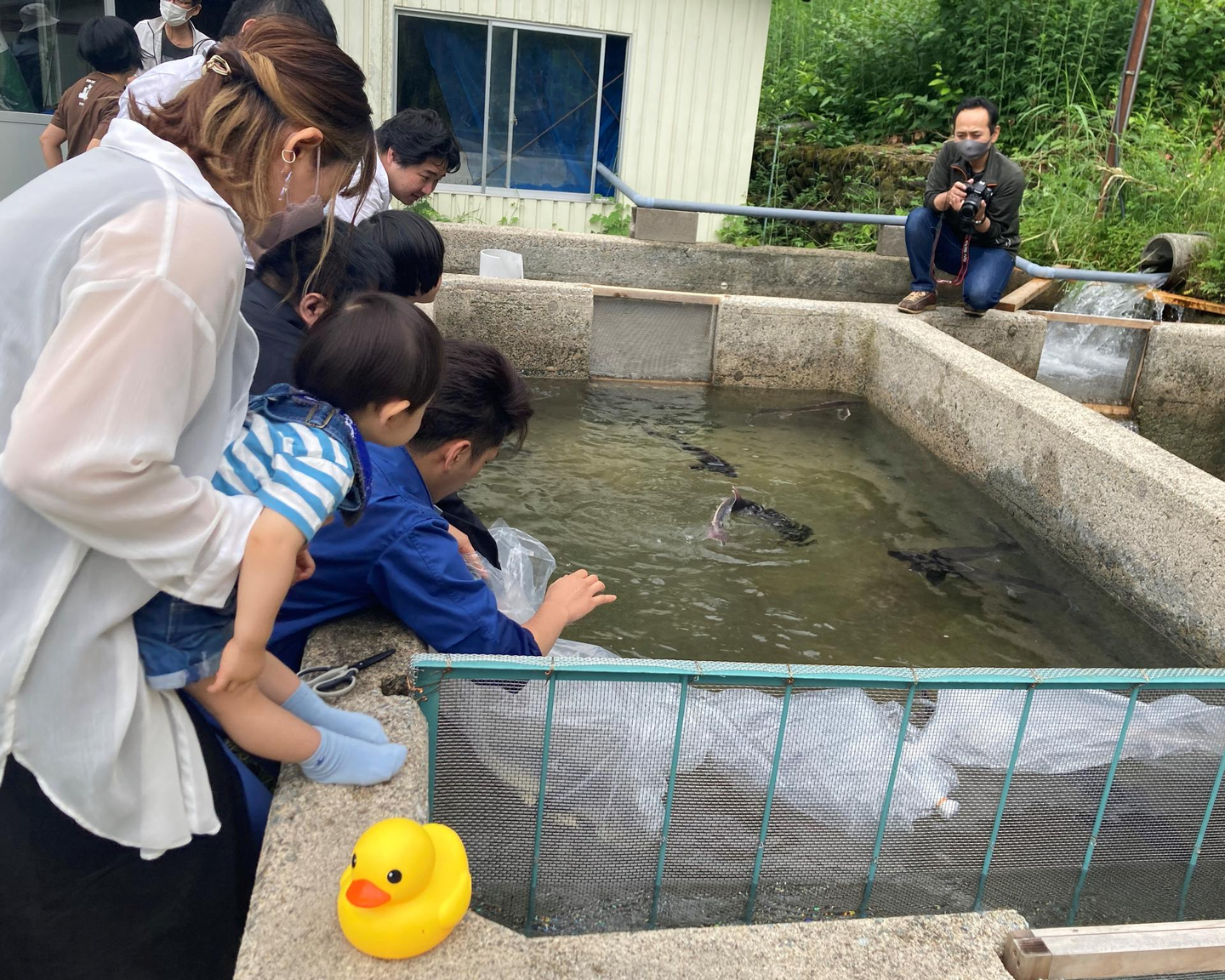 そして今回はチョウザメの一種である、「ベステル」の稚魚100匹を室内へ、お試しとして成魚10匹を屋外の生簀へ放流しました。