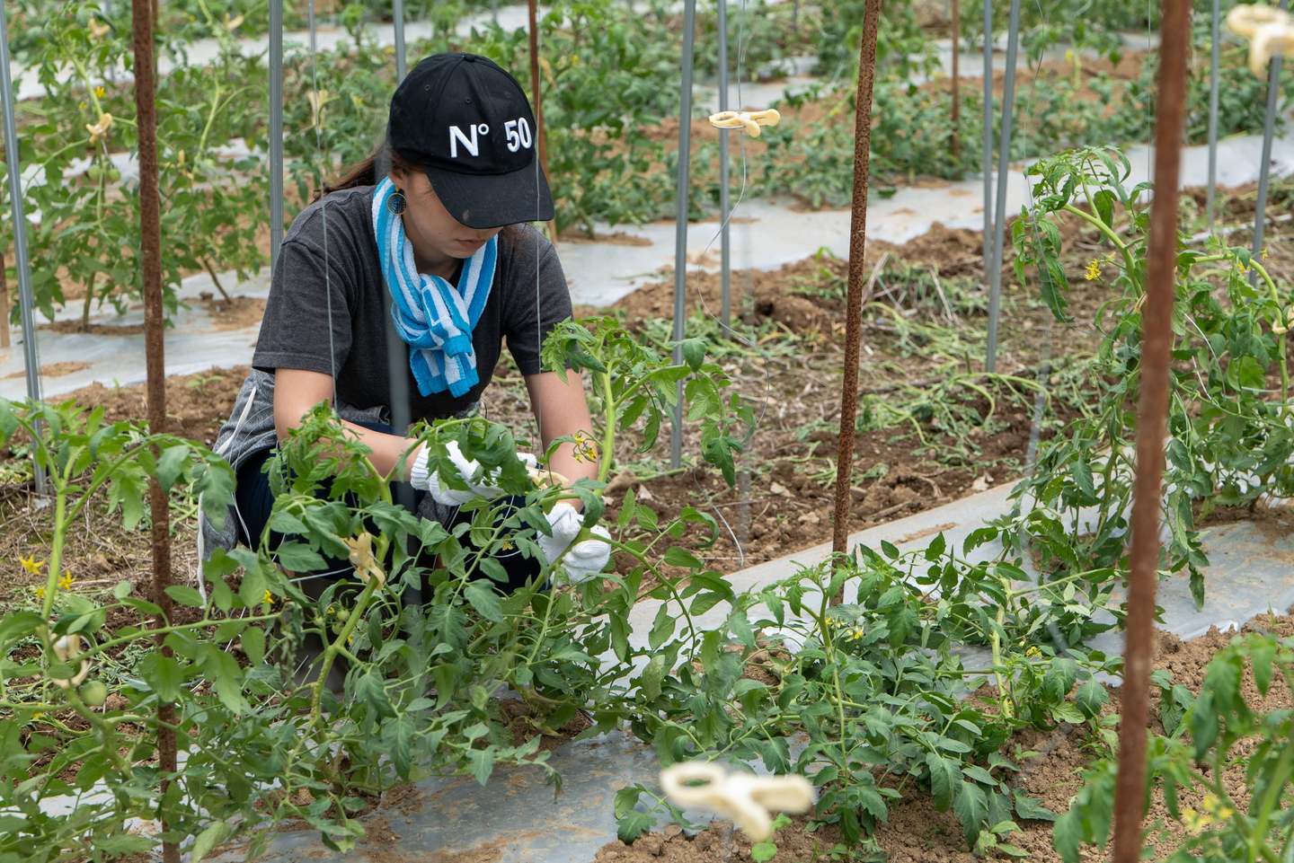 畑にて”誘引”の作業。数百本のトマトを前に、黙々と作業したそうです。