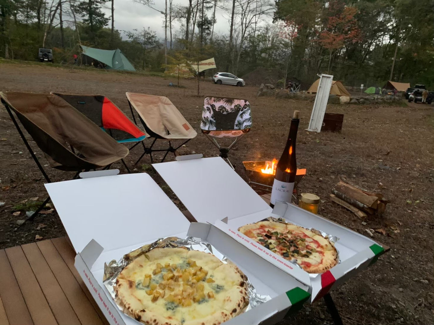 テントとチェアを組み立て火をおこし終わったタイミングで、ワインショップ&レストラン「72season's」からお届けしてもらった自慢の石窯ピザを堪能。