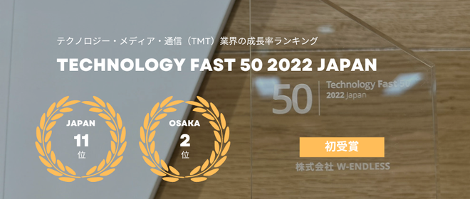 こんにちは、株式会社W-ENDLESS人事の守屋です!この度、デロイト トーマツ グループが発表したテクノロジー・メディア・通信(TMT)業界の成長率ランキング「Technology Fast 50 2022 Japan」にて、W-ENDLESSが過去3決算期の収益(売上高)成長率193.3%を達成し、11位を獲得いたしました!!(関西では2位!!)授賞式の様子Technology Fast 50 2022 Japan とは?デロイトが世界規模で開催しているTMT業界における成長企業を表彰する国毎のランキングプログラムの日本版です。TMT業界での成長性や成功のベンチマークであり、今回で2...