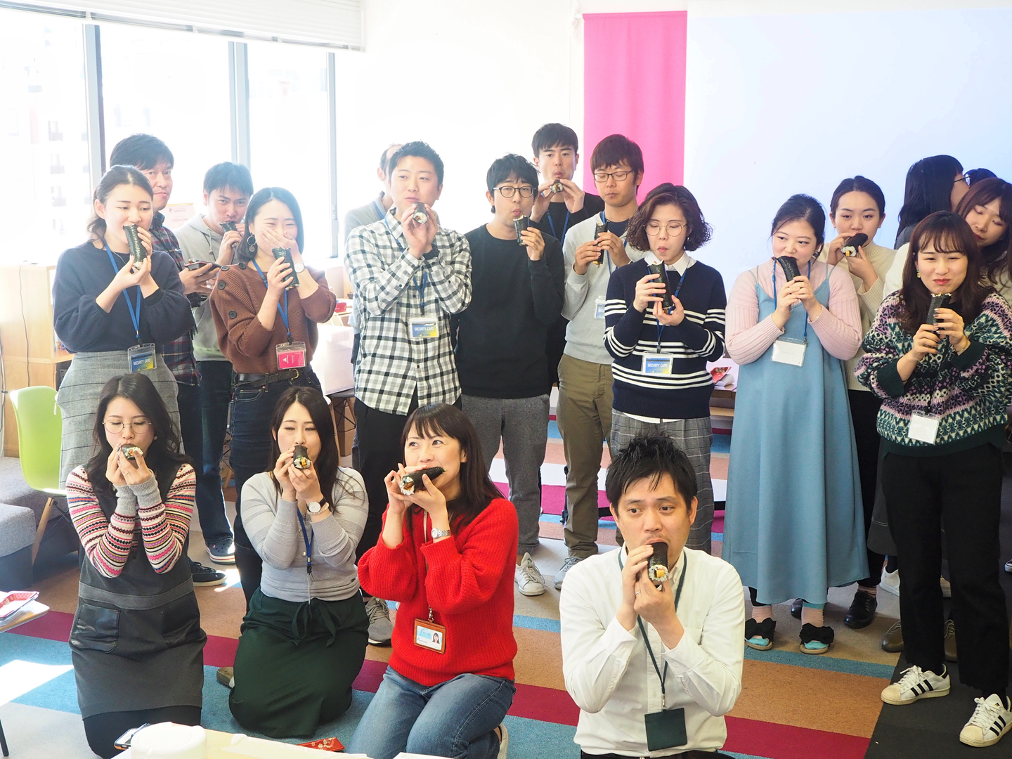 恵方巻きは「恵方(その年の吉方)を向いて、黙って、一本噛み切らずに食べる」というのが正しい食べ方のようで、今回のイベントはそれにならい、非常にシュールではありますが、全員で恵方を向いて、黙々と食べるというコンセプトになりました(笑)
