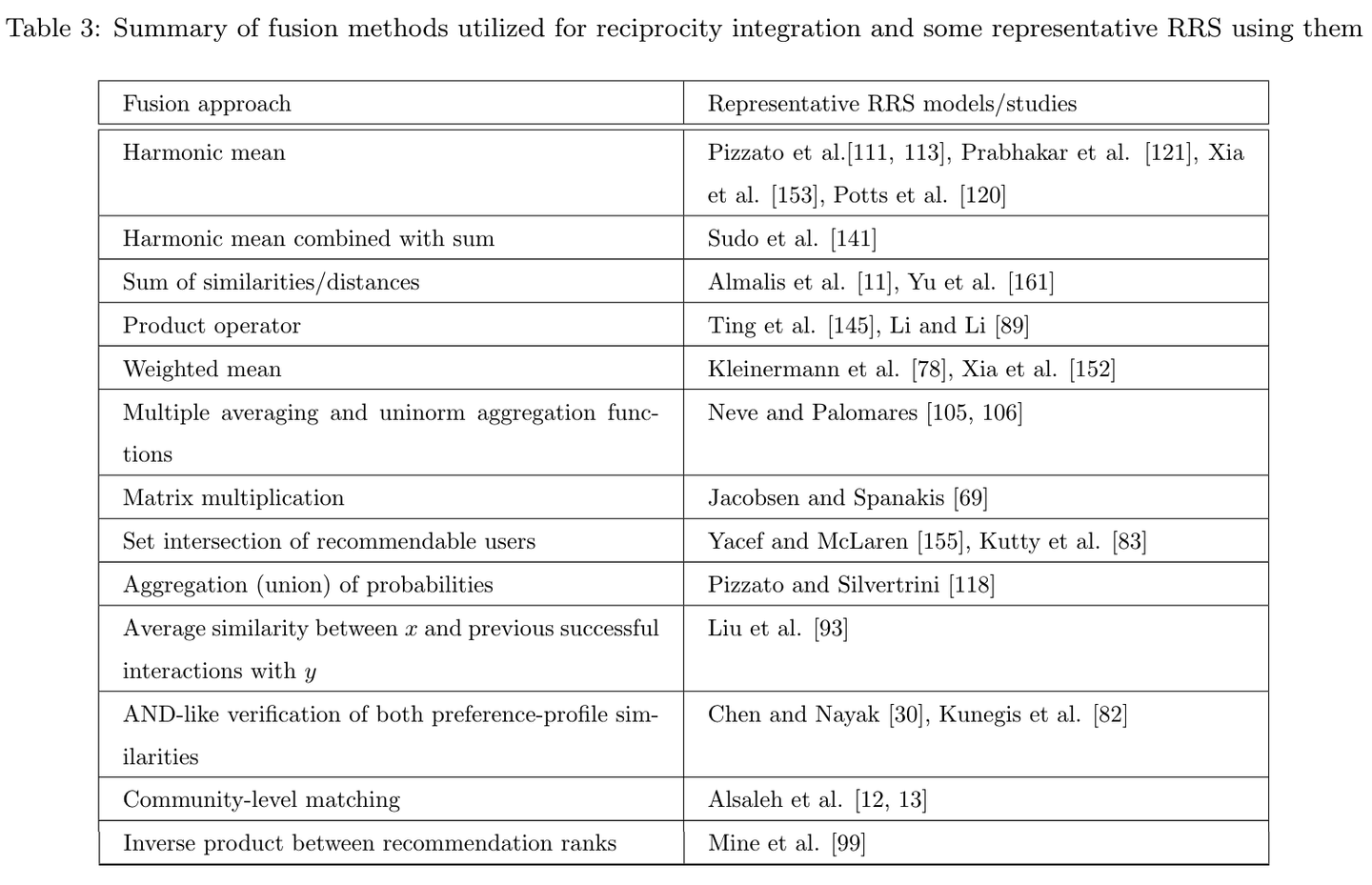 本記事で焦点をあてるのは、前述した3つ目の「嗜好スコアを集約するコンポーネント」です。2つの嗜好スコアをどのように統合するかは自明ではなく、過去の研究では算術平均、調和平均、幾何平均など様々な関数が用いられています。以下の表は、Palomares et al. (2021) で紹介されている、相互推薦に関する研究で取られているアプローチをまとめたものから抜粋したものです。各研究でそれぞれ異なるアプローチが取られており、統一的な最適解が存在しないことがわかります。