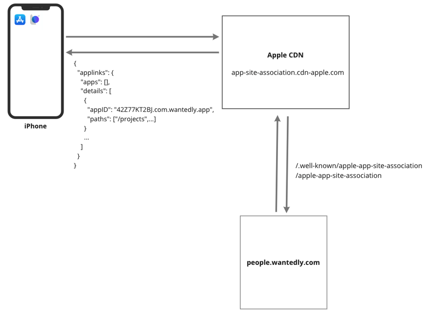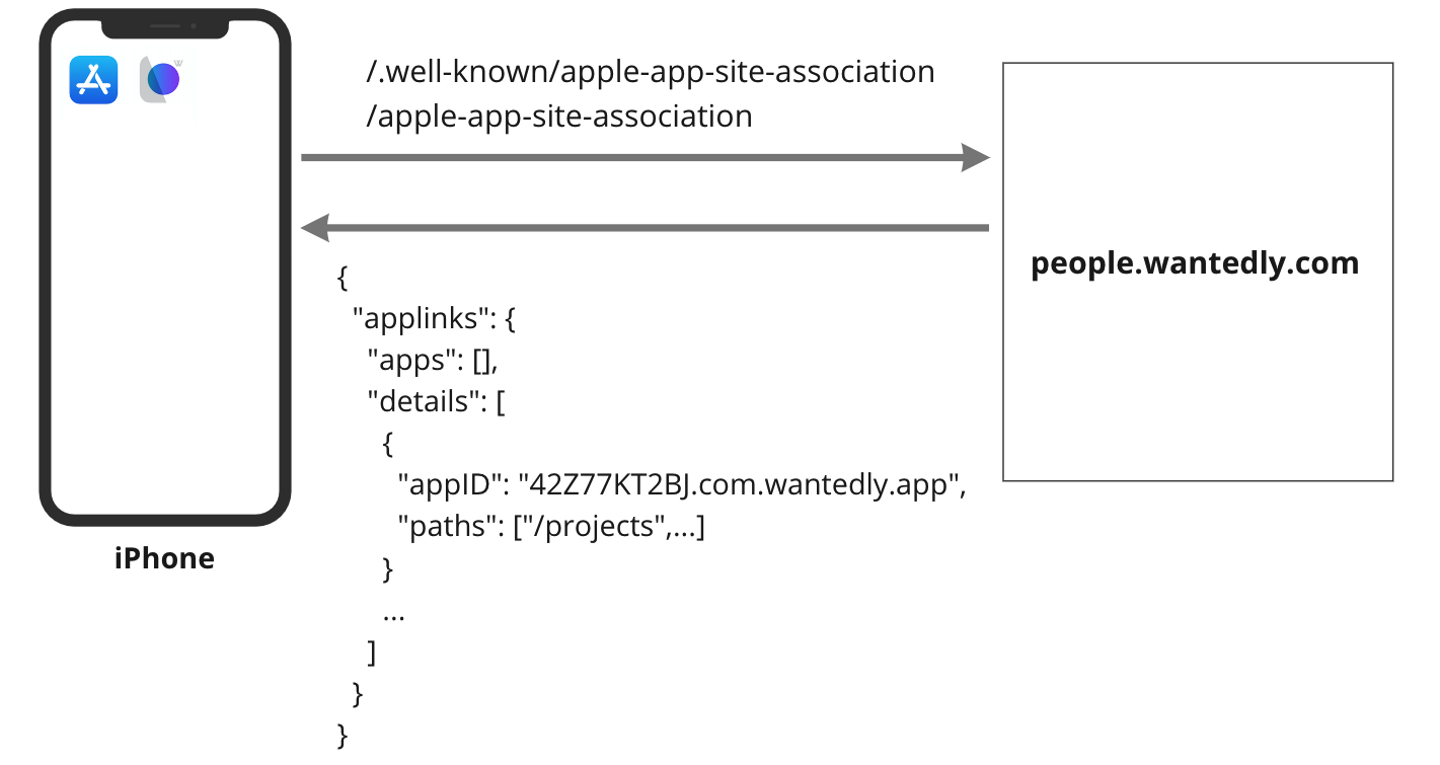 今までの Universal Links では解決したいURLのドメイン (例えば https://wantedly.com) の /.well-known/apple-app-site-association あるいは /apple-app-site-association にリクエストしていたはずです。一体何が変わったのでしょう?