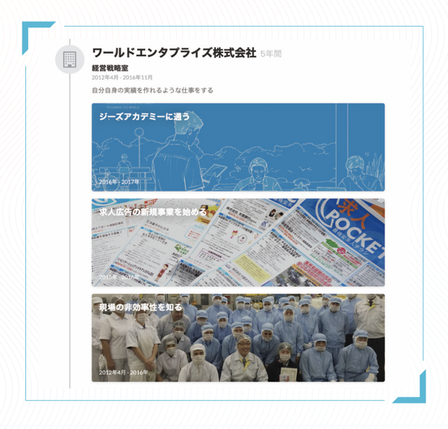 各職歴でやったこと、関わったプロジェクト、アピールしたい成果などを写真・動画・数字・WEBページへのリンクなどを用いて、表現してみましょう。そのプロジェクトにかけた思いや心がけたことを書いておくと、より一層あなたらしさが伝わるでしょう。