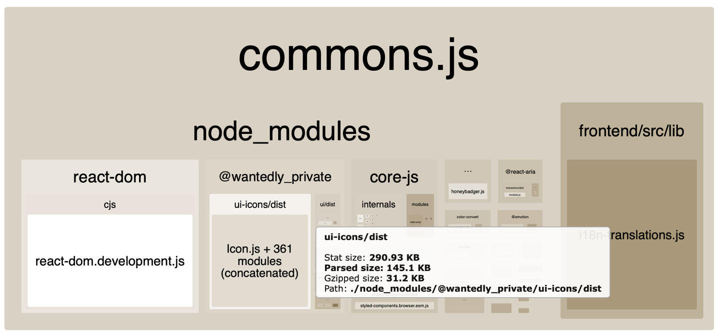 });実際に Icon コンポーネントを使う際には name prop は定数として使うケースが大半ですから、webpack には特定のアイコン画像しか使われないことを考慮した tree shaking を行なって欲しいものですが、どうやら Webpack Bundle Analyzer のレポートを見る限りでは使われていないアイコン画像の削除は行われていないようです。