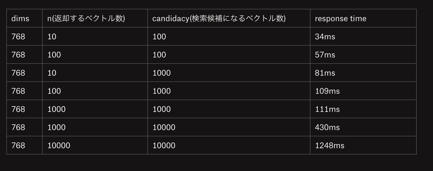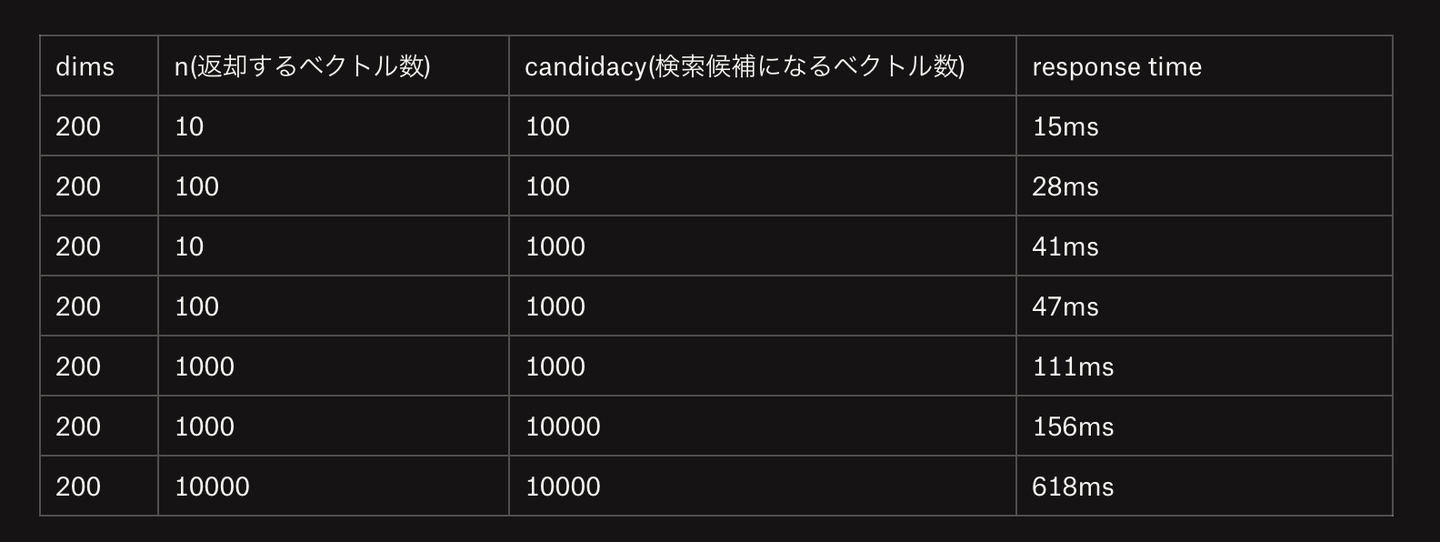 Elasticsearchに保存しているドキュメント数10万件で、ベクトルは200次元、768次元で試しています。