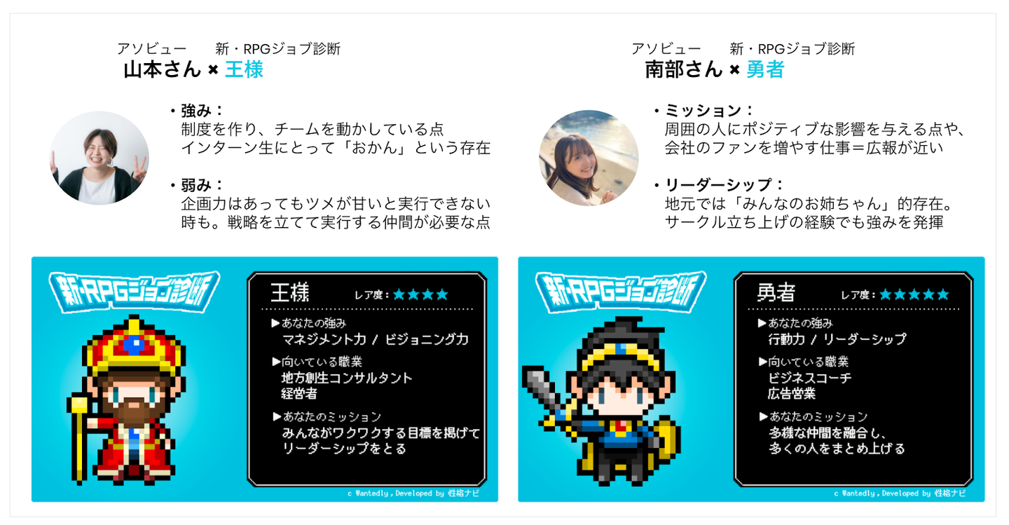 私の結果は「王様」で、ミッションはまさに当てはまっていると感じます。現在30名ものインターン生が所属する組織をマネジメントして新規事業を推進しているため、見事に言い当てられたなという印象でした!
