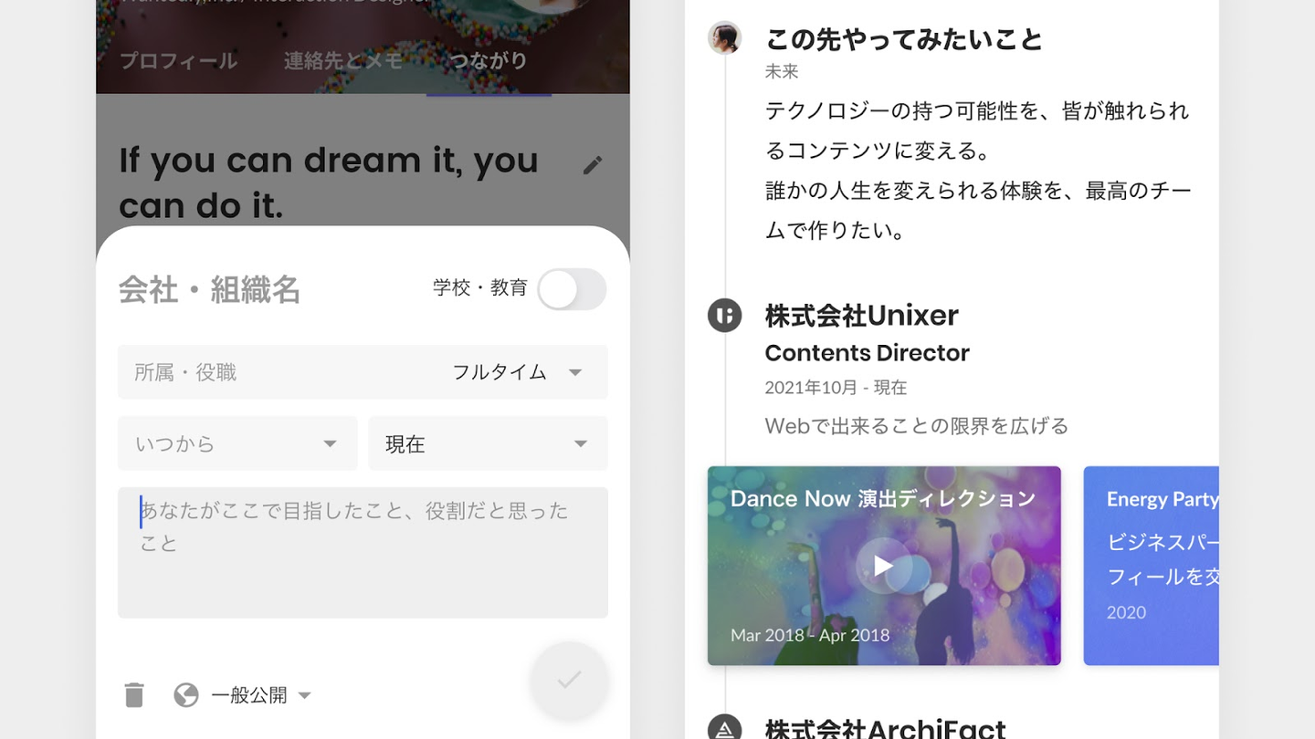 新たなアプリ版のプロフィールにおいては、「想いと行動であなたを綴ろう」というコンセプトはPC Web版と一貫しており、仕事への「想い」を「あなたがここで目指したこと、役割だと思ったこと」欄で、実際の「行動」をカード形式で視覚的にリッチに表現することができます。