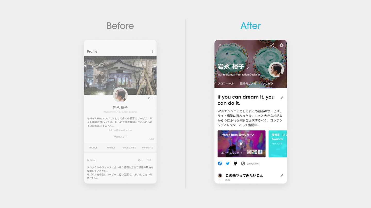 プロフィールへのニーズが高まる中、WantedlyにおいてはまずはPCのWeb版のプロフィールを「想いと行動であなたを綴ろう」というコンセプトの元、オンライン版職務経歴書の様な存在から、仕事の転機を呼び込む「あなたのシゴトを物語る、1ページ」として2020年末に一新しました。