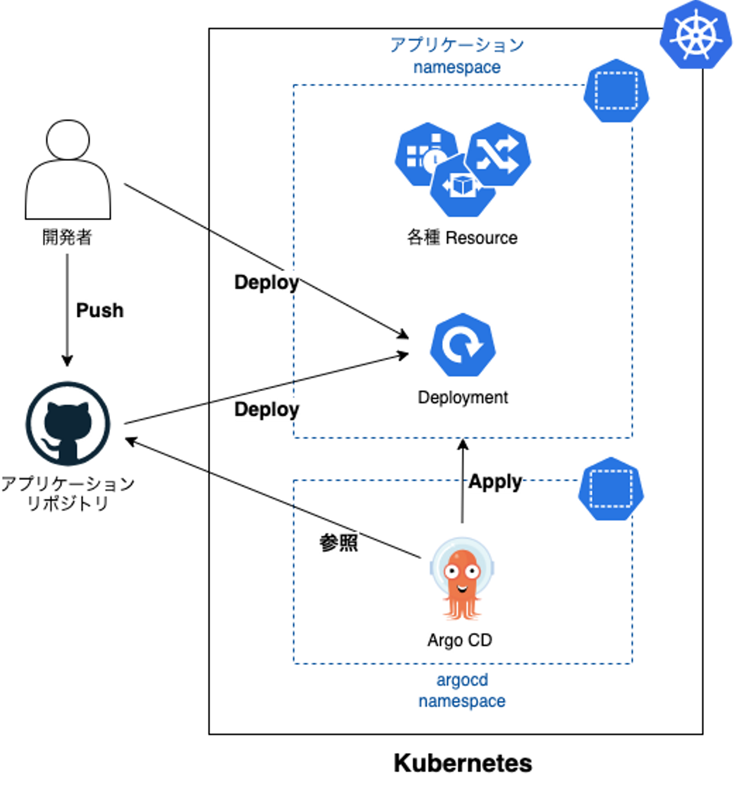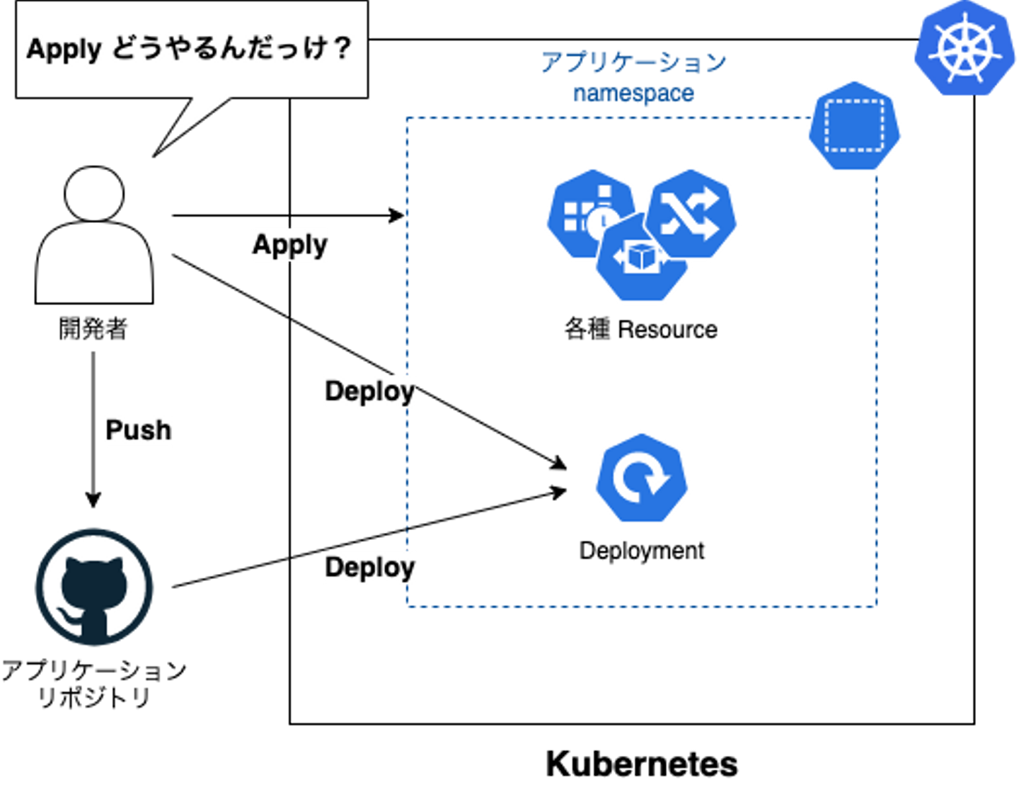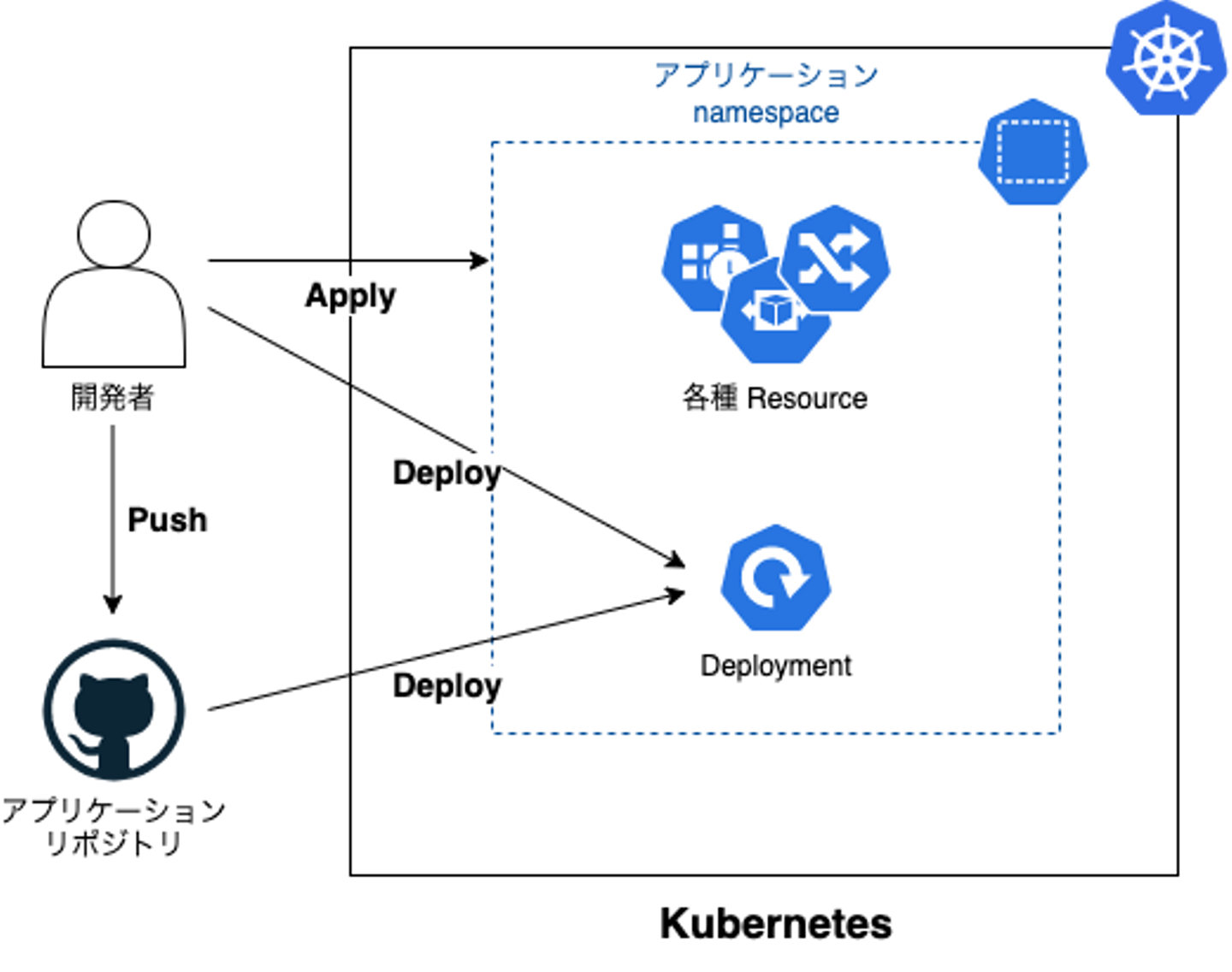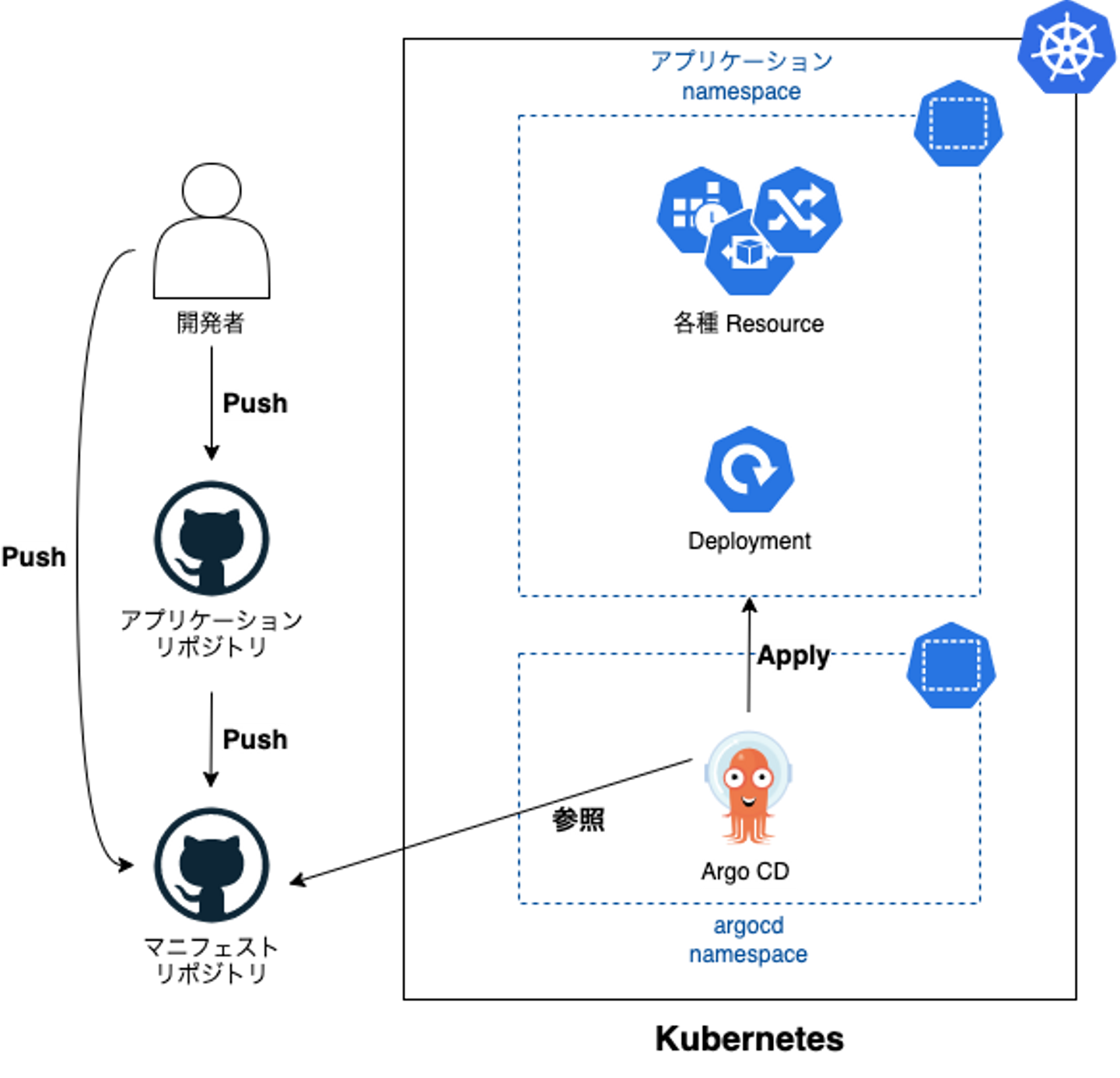 - Apply は GitHub リポジトリの k8s manifest の内容で、 k8s resource の内容を上書きする作業